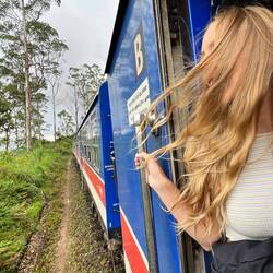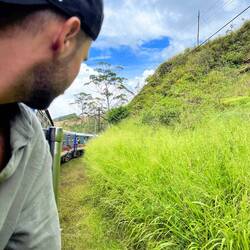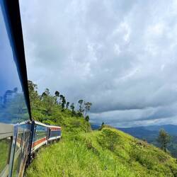 Der Zug traf pünktlich ein und so begann unsere 7-stündige Reise nach Ella. Da alle Tickets für die 2. & 3. Klasse ausgebucht waren, „mussten“ wir in der 1. Klasse die klimatisiert war sitzen. Wir hatten keine beieinanderliegenden Sitze reserviert aber das war kein Problem. Die anwesenden Passagiere schauten für uns und schnell sassen wir nebeneinander. Das besondere an dieser berühmten Zugfahrt ist, dass die Türen während der ganzen Fahrt offen bleiben. So stellten wir uns schon nach kurzer Zeit an die Tür und genossen die atemberaubenden Aussichten. Die Vegetation verändert sich gefühlt nach jeder Kurve und wir sahen tosende Flüsse, hohe Wasserfälle, riesige Teeplantagen und dichter Dschungel. Die Menschen winkten uns aus Ihren Fenstern und Kinder rannten voller Freude mit dem Zug mit.