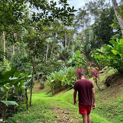 Schnell packten wir alles zusammen, assen ein karges Frühstück und weg waren wir. Um 10:00 Uhr startete unsere Kaffee & Schokoladentour auf der Northfields Farm. Zu Beginn erzählte uns Caesar bei einem Spaziergang durch die Kaffeeplantage einiges über die Enstehung der Kaffeekultur.
