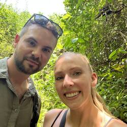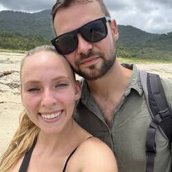 Die Nacht war lang, denn richtig gut geschlafen haben wir bei all den Geräuschen leider nicht. Früh morgens assen wir das leckere Frühstück (Gallo Pinto mit Rührei und Tortilla) und um 9:00 Uhr erwartete uns Carlos bereits in weissem Sonntagshemd mit Machete und 2 Pferden. Einen Helm suchten wir vergebens und nachdem er uns die Steigbügel richtig eingestellt hatte, ging es auch schon los. Wir ritten über grüne Weiden auf denen Kühe und Pferde ihre Tage verbrachten, durch dichten Dschungel und steile Hänge hoch und runter. Als wir gerade einen hohen Baum passierten, sprangen um uns herum lauter Weissrüsselnasenbären (Pizote) von oben herab und liefen schnell davon. Es war eine ganze Familie mit Jungtieren und es war lustig zuzusehen, wie sie fast vom Baum flogen, so eilig hatten sie es wegzukommen. 😂🦝 Unsere Pferde waren zum Glück überhaupt nicht schreckhaft, wahrscheinlich sind sie solche Begegnungen gewöhnt. Nach einem besonders steilen Abschnitt stieg Carlos vom Pferd, deutete in den Wald und sagte „Cascada“, was Wasserfall bedeutet und wir zum Glück verstanden 😜. Die Pferde wurden angebunden und los ging unsere überraschende Wanderung. Man sah, dass dieser Weg nicht oft von Menschen benutzt wird. Es ging durch kleine Flüsse und an Schluchten entlang. In schlammigen Abschnitten konnten wir sogar Tapir Spuren entdecken, leider sahen wir aber kein lebendiges Exemplar. Der Wasserfall war wunderschön und wir freuten uns sehr, dass Carlos uns bei einem kurzen Snack (er hatte uns Ananas mitgebracht🤭) viel über die Natur und Ihre Bewohner zu erzählen versuchte.. in Spanisch😅 Rocco versteht zum Glück ein paar Brocken durch seine Italienischkenntnisse und es wurde ein lustiger Rückweg. Unterwegs begegneten wir einer riesigen Spinne und einer Gruppe Brüllaffen, die uns von hoch oben frech mit Zweigen und Steinchen bewarfen.