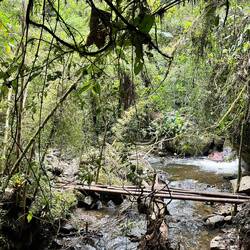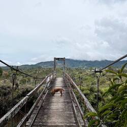 Nach einer kurzen Zeit erreichten wir den ersten Checkpoint, wo wir uns für je 5‘000 COP ein Armband kaufen mussten um mit dem eigentlichen Wanderweg zu beginnen. Der erste Teil des Weges führte uns durch abwechslungsreiches Terrain und über drei ziemlich morsche, teils einsturzgefährdete Hängebrücken. Es war eine unterhaltsame Wanderung mit vielen tollen Ausblicken bis sich unser Weg am Abzweiger für das Kolibri Haus trennten. Kontaktdaten wurden ausgetauscht, ein Erinnerungsfoto geschossen und danach nahmen Rocco und ich den extra Kilometer bergauf in Angriff währenddem Anne und Andreas aus Zeitmangel dem regulären Wanderweg folgten.