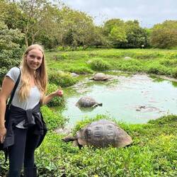 Auf der El Chato Ranch leben die Galàpagos Schildkröten in freier Wildbahn. Sie können das Grundstück verlassen, wenn Sie wollen aber sobald die Trockenzeit anbricht, sind sie gerne freiwillig auf den grünen Wiesen oder in den schlammigen Wasserlöchern auf der Ranch um sich abzukühlen. Unser Guide führte uns herum und erzählte spannende Fact‘s zu den riesigen, uralten Reptilien. Wenn man ihnen beim Fressen zuschaut, sieht es so aus als ob sie Dinosaurier sind.. was sie ja auch irgendwie sind.😅 Es ist so faszinierend diese Tiere zu beobachten, ich kann immer noch nicht fassen wie gross sie sind. Einfach unglaublich. Die Tiere auf unseren Fotos sind übrigens alle zwischen 100-150 Jahre alt. Die jüngeren Schildkröten haben noch sichtbare Rillen auf dem Panzer, diese verschwinden aber mit zunehmendem Alter. (Das Gegenteil ist bei Bäumen der Fall 🪵)