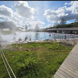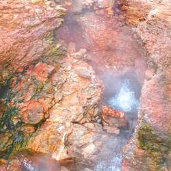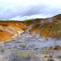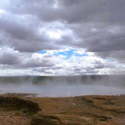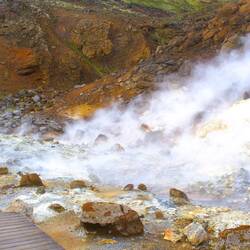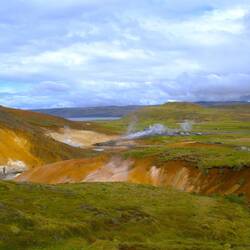 Hier sind wir wieder in einem Geothermalgebiet, man sieht es bereits bei der Anfahrt. Überall raucht es und liegt ein Schwefelgeschmack in der Luft.