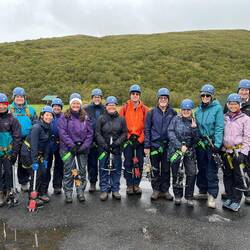 Half a km in, the track turned off the ridge and suddenly there was no wind. The rain eased shortly after. The track was moderately hard for us old timers but not for the hundreds of others we passed on the track.