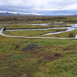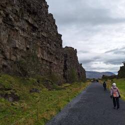 First up after breakfast, we drove to Thingvellir National Park. This is on the line through Iceland where the Eurasian and Nort American tectonic plates meet. The plates are pulling slowly apart, forming a valley. This is also the location where the initial Icelandic parliament, the Althingi met in 930AD. It continued to meet there each autumn for centuries. It was very windy. We walked to the nearby waterfall, church and Prime Ministers old summer residence.