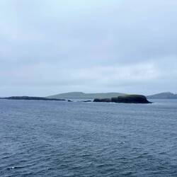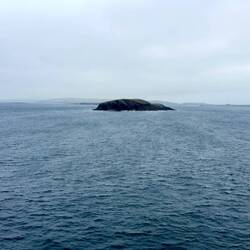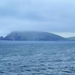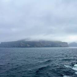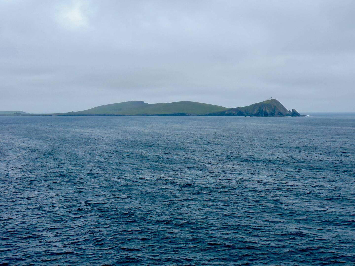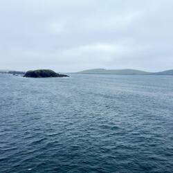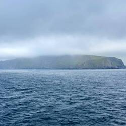 Ce matin surprise, nous passons au large des îles Shetland. Magnifique paysage dans la brume.