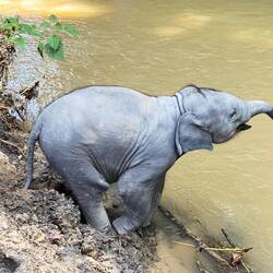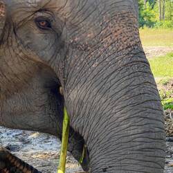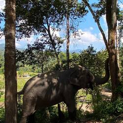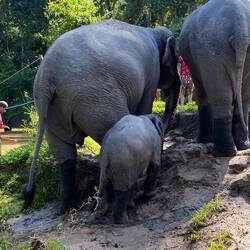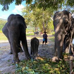 Es waren früher Arbeiterelefanten, wo Baumstämme transportieren mussten. Jetzt können sie sich frei im grossen Areal bewegen. Es hat eine grosse Grasfläche, einen schönen Fluss und eine Hügel voller Bäume für sie.