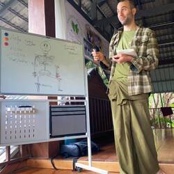 Weiter geht es mit Yogaanatomie und Yogaphilosophie. Dann bereits wieder zum leckeren veganen Mittagessen.