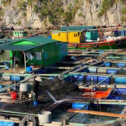 We travelled on a boat through the bays off Cat Ba. We travelled through the floating village of Cai Beo.
