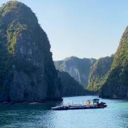 Wir sind auf einem Boot durch die Buchten vor Cat Ba gefahren. Dabei sind wir durch das schwimmende Dorf Cai Beo gefahren.