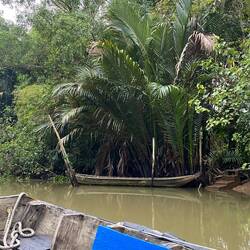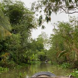 Weiter sind wir in eine der unendlich vielen Seitenarme des Mekongs geschippert. Es ist traumhaft, von den vielen Wasserhyazinthen umgeben zu sein. Das Ufer ist gesäumt von riesigen Palmen mit Wasserkokosnüssen und Mangrovenbäumen.