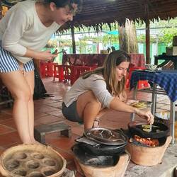 Well, what can I write. Some of you have already heard that we didn't make it to the dream island. We set off happily from the Mekong Delta and arrive at the harbour and are told that there are no more ferries today. The weather was too bad, I was told, while I had the sun on my face. As there was practically no wind, it was difficult to understand the decision.... Sadly, we booked into a nearby hotel and set off in search of food. We realised that the town of Rach Gia is not touristy and there weren't many vegetarian options. Luckily, we found the large Mall Lotti again - our safe haven! After a lot of back and forth, we managed to get a vegetarian hotpot there. It was soooo delicious!