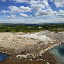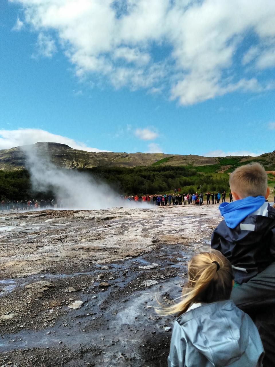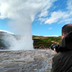 Nog eens kijken bij Geysir, nu overdags en daarmee parkeerplaats zoeken en struikelen over de hordes toeristen die allemaal vooraan willen staan maar niet in de stoom...