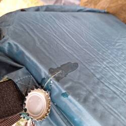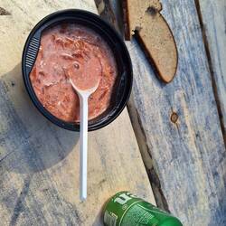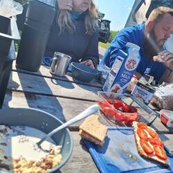 Heute morgen aufgestanden, Mist, die Panzertapereparatur an der Isomatte hat nicht geholfen, Luft ging raus, dadurch wurde es hart unterm Rücken. Dafür hat der Teamchef gut geschlafen, eigenerLue lisää