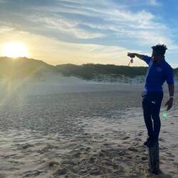 Nkosie looks after our stuff whilst we dive into the sea 🌊Lue lisää