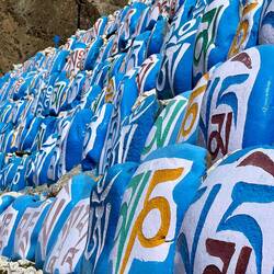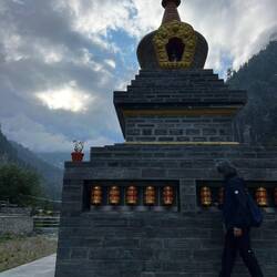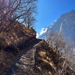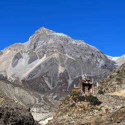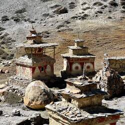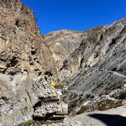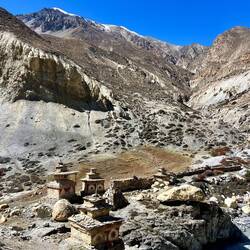 Beautiful trail through a narrow valley along the mountain with stunning views and old tibetan stupas and ruins.