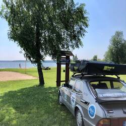Ein sonniges Frühstück unter Apfelbäumen in Litauen, der Morgen begann entspannt! Die beiden Gastgeber waren sehr freundliche Menschen und bei der Verabschiedung tauschten wir mit beiden unseren Tee und Schokolade aus Estland in eine selbst gemachte Räucherstange aus Sumpfporst, die wohl einen sehr angenehmen Duft verströmen soll und in Innenräumen gegebenenfalls leicht betäubend sein kann. Schade, dass wir sie nicht selber ausprobieren können 😅 dazu erhielten wir auch noch eine Flasche mit selbstgemachtem Cider. Dabei waren die beiden die letzten Jahre durch Corona und jetzt auch die Kriegssorgen möglicher Touristen gebeutelt. Schön, dass einige Rallye Teams hier übernachtet haben.