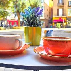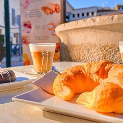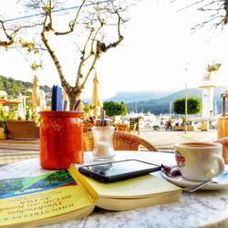 Natürlich durfte eine Kaffeepause nicht fehlen! In einem kleinen, traditionellen Café bestellten wir einen heißen Café con Leche ☕ und dazu eine Coca de Patata 🍪, das süße, fluffige Kartoffelgebäck, für das Valldemossa berühmt ist. Ein Genuss!