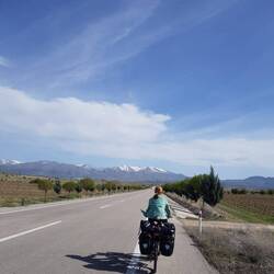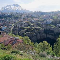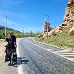 Früh sind wir wach und frühstücken bereits um sieben Uhr bei herrlichem Blick auf den Hasandağı. Und wenn es so schön ist, gibt es auch keinen Grund zur Eile. Halb elf ist es, als die Fahrräder bepackt und wir bereit zur Weiterreise sind. Durch Zufall haben wir entdeckt, dass in drei Kilometern Entfernung direkt an unserer Route eine unterirdische Stadt liegt. Da wir eine ähnliche Attraktion in Kaymaklı durch die Routenänderung aus dem Reiseprogramm gestrichen haben, drängt sich hier ein Besuch nun quasi auf. Die "Aziz Mercurius Yeraltı Şehri" im kleinen Dorf Saratlı ist schnell erreicht, unser Aufenthalt gestaltet sich allerdings recht kurz. Nach einem ersten Eindruck in der unterirdischen Stadt müssen wir feststellen, dass FlipFlops nicht das geeignete Schuhwerk für den Gang durch die tiefen, engen Gänge ist, wo eher Trittsicherheit gefragt ist. Wir verzichten also auf die vollständige Erkundung der Stadt und fahren weiter. Das, was folgt, betitelt Heiko als "Katalogradeln". Und tatsächlich könnte man meinen, er fährt vor einer Fototapete mit dem Motiv einer violett und gelb blühenden Wiese vor sonnenbeschienenem Schneeberg.