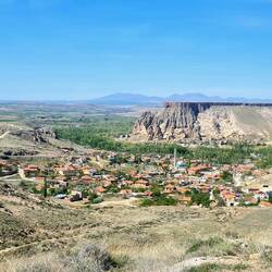 Bald verspüren wir einen nicht unerheblichen Hunger, da kommt uns ein erreichter "Minigipfel" gerade recht, Gipfelsturm zieht ja bekanntermaßen Chipsbelohnung nach sich. Auf einer Schotterpiste rumpeln wir anschließend dem Hasandağı entgegen, der weiterhin dass Landschaftsbild dominiert. Nach ca. 6 Kilometern haben wir wieder Asphalt unter den Reifen und den Ort Selime vor der Nase. Hier werden wir durch die typischen Gesteinsformationen eindrücklich daran erinnert, dass wir uns im weitläufigen Gebiet Kappadokiens befinden. Zu unserer Linken passieren wir die Kathedrale von Selime, ein hoch aufragender Felskomplex mit Räumen, Fenstern, Treppen und einer Kirche auf der Spitze. Schon der Anblick dieser Felsenkathedrale von außen bestätigt, dass einem neben den Highlights der Gegend mit den Tälern rund um Göreme auch die weniger bekannten Stätten ein aufrichtiges Staunen entlocken können. Heute verweilen wir an dieser Stelle nicht, da wir vorhaben, am morgigen "Ruhetag" im Anschluss an eine Schluchtwanderung hierher zurückzukehren. Wir nehmen stattdessen den nächsten Anstieg in Angriff und werden oben angekommen mit einer fantastischen Aussicht auf das Dorf Yaprakhisar und die beeindruckende Landschaft belohnt. Wir nutzen diesen herrlichen Platz für eine Kaffee-Tee-Keks-Pause, bevor es auf den Endspurt in Richtung des heutigen Zielortes Güzelyurt geht. Unterwegs durchqueren wir das Dorf İhlara und können einen ersten Blick in die gleichnamige Schlucht werfen, die wir morgen besuchen wollen. Kurz bevor wir Güzelyurt erreichen befragen wir Google nach Hotels vor Ort und entscheiden uns für ein Haus, welches laut Beschreibung über mehrere einladende Terrassen mit Panaramablick auf Stadt und Hasandağı verfügt. Wir sehen uns schon vor unserem inneren Auge auf einer der Terrassen sitzen und den Sonnenuntergang genießen. Also los, nichts wie hin! Kurz nach Ortseingang werden wir von einem jungen Paar auf deutsch angesprochen. Vermutlich haben sie die kleine deutsche Fahne gesehen, die auch in diesem Jahr neben einer türkischen an Heikos Fahrrad weht. Die beiden kommen aus der Nähe von Hannover und sind vor etwa einem Jahr hierher, in die Heimat ihrer Familien gezogen. Ihren Lebensunterhalt verdienen sie nun mit einem kleinen Market und damit, dass sie ein Erdbeer- und ein Lavendelfeld bewirtschaften. Nach kurzem Plausch fahren wir weiter, schließlich ruft die ersehnte Hotelterrasse. Der Standort ist schnell gefunden, das Hotel jedoch nicht..., schade. Das nächste Hotel, ebenfalls mutmaßlich mit Terrassen-Sonnenuntergangsoption, finden wir zwar, sind aber bei Ankunft vor dem Haus so genervt von der Aufdringlichkeit der uns sofort belagernden Mitarbeiter, dass wir weiterfahren. Schließlich steuern wir das Hotel Osmanoğlu an, das zwar im Netz sehr gut bewertet wird, unser Bild von chillenden Radlern auf Terrasse vor Berg und Sonnenuntergang aber nicht erfüllen kann. Vielmehr sitzen wir in einem hübschen Garten, der zu allen Seiten von altehrwürdigen Mauern umgeben ist und warten bei einen Kaffee darauf, unser Zimmer beziehen zu können. Über die kleine Enttäuschung der nicht vorhandenen Panorame-Terrasse tröstet die Tatsache hinweg, dass wir es mit überaus netten Gastgebern zu tun haben und ein sehr besonderes Zimmer zugewiesen bekommen. Ein großer, sehr hoher Raum, der eher einem Gewölbe gleicht, wird nun für zwei Tage unser Zuhause sein. Die Sonne ist inzwischen ohne uns untergegangen, also widmen wir uns nach ausgiebiger Dusche dem, was wir besonders gut können: Essen! Im Restaurant "Ailem" (Meine Familie) genießen wir ein leckeres 3-Gänge-Menü (heute köstliche Joghurtsuppe OHNE Pansen...), bevor wir den heutigen Tag für beendet erklären.Læs mere