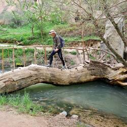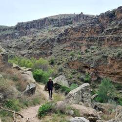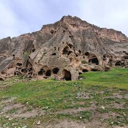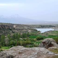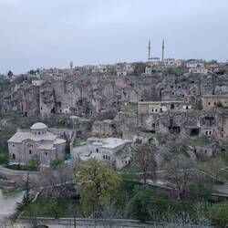 Zur vereinbarten Zeit um acht Uhr begeben wir uns in das höhlenartige Frühstücksgewölbe. Von unseren Gastgebern, einem jungen Mann und seiner Mutter, bekommen wir ein herrliches Frühstück mit allerlei Köstlichkeiten serviert. Mit gut gefülltem Magen rüsten wir uns für den Tag. Die Räder haben Pause, dafür werden die Tagesrucksäcke mit Proviant gefüllt und das festes Schuhwerk geschnürt. Als wir unseren Gastgeber fragen, ob er uns ein Taxi rufen könne, bietet er sich kurzerhand selbst als Shuttle-Service zu unserem heutigen Ziel an. Nach etwa zwanzig Minuten erreichen wir das Ihlara-Tal an der Grenze zwischen den Provinzen Güzelyurt und Aksaray, welches wie auch die ganze Landschaft Kappadokiens durch die Vulkanausbrüche des Hasandağı entstanden ist. Geformt wurde das 14 Kilometer lange Tal durch den Fluss Melendiz. Vom Talrand im malerischen Ort Ihlara, wo wir uns absetzen lassen, steigen wir hinab in die 150m tiefe Schlucht, die auch "Grand Canyon der Türkei" genannt wird (naja...). Diese wurde unserer Internet-Recherche zur Folge im 8. Jahrhundert zum Rückzugsort byzantinischer Mönche, da sie in Zeiten der Verfolgung angesichts schwerer Zugänglichkeit ein ideales Versteck darstellte. 150 Kirchen werden am Melendiz-Fluss zwischen Ihlara und Selime vermutet, bislang wurde erst ein kleiner Teil davon entdeckt. Umgeben von üppigen Bäumen und steilen Felswänden auf beiden Seiten nehmen wir die 14 Kilometer in Angriff. Unterwegs nehmen wir die eine oder andere der versteckten Höhlenkirchen, die in die Seitenwände gehauen wurden, in Augenschein. Trotz deutlicher Spuren von Vandalismus sind hier noch teilweise gut erhaltene Wandmalereien mit Szenen aus dem Neuen Testament zu sehen. Es ist ein angenehmes Spazieren im nur spärlich von anderen Menschen besuchten Tal: Mal unter schattigen Bäumen, mal in der Sonne, begleitet von Krötengequake und Vogelgezwitscher, immer entlang des Flusses, verlaufen ist quasi ausgeschlossen. Auf halber Strecke erreichen wir das Dorfes Belisirma, welches auch einen Zugang zur Schlucht bietet. Hier tummeln sich dann auch doch viele Menschen, was offensichtlich daran liegt, dass diverse kleine Restaurants am Fluss zur Einkehr einladen. Auch wir gönnen uns Tee und Gözleme, bevor wir weiterziehen. Der zweite Teil unserer Wanderung unterscheidet sich deutlich vom ersten, denn die Schlucht wird breiter und offener. Uns gefällt dieser Abschnitt sehr gut, zudem sind wir auch wieder fast allein unterwegs, seit wir Belisirma hinter uns gelassen haben. Unsere Wanderung endet schließlich im Dorf Selime, wo wir schon auf unserer gestrigen Radel-Etappe an der in den weichen Tuffstein gehauenen und sich über mehrere Etagen erstreckende Felsenkathedrale vorbeigekommen sind. Wir sitzen auf einer Mauer vor der wahrlich beeindruckenden Kathdrale und hadern mit uns: Reingehen oder nicht reingehen? Einerseits wäre es doch schön blöd, sich die Besichtigung dieser faszinierenden Anlage entgehen zu lassen, wenn man schon direkt davor sitzt...., anderseits sind wir aber auch total platt. Ein Mann, der scheinbar für den Parkplatz zuständig ist, fragt uns, ob wir die Kirchen in der Schlucht gesehen hätten. Das Innere der Kathedrale würde genauso aussehen, nur ohne Malerei, erklärt er uns. Das ist für uns das Zeichen, dem Ruf unserer schwächelnden Körper zu folgen und ohne Besichtigung unseren Hotelgastgeber zwecks Abholung zu kontaktieren. Zurück in Güzelyurt plündert Heiko einen Supermarkt und bald darauf sitzen wir bei Tee und allerlei Leckereien im Garten unseres Hotels unter einer lilafarbenen und von schwarzen Hummeln umschwirrten Blütenpracht. Am frühen Abend raffen wir uns noch zu einer kleinen Erkundung von Güzelyurt auf. Nachdem Heiko einen kleinen Drohnenflug zur ca. fünf Kilometer (Anmerkung des Drohnenpiloten: Luftlinie 1,2km) entfernten festungsartigen Yüksek Kilise (hochgestellte Kirche) unternommen hat, spazieren wir zu dem in Google Maps verzeichneten Aussichtspunkt Bakı Noktası. Wir sind hellauf begeistert angesichts des großartigen Blicks über die Stadt mit ihrer historischen Architektur, die bisweilen mit den Felsen verschmilzt. Es ist schon fast dunkel, als wir vor dem Ausgang einer unterirdischen Stadt stehen und überrascht sind, dass Licht in der Höhle brennt. Der erste Blick hinein ist fast ein wenig gespenstisch, Schatten huschen vorbei, vielleicht Fledermäuse? Wir wagen einige Schritte hinein und schauen uns um, die Gänge verzweigen sich wie in einem Labyrinth. In die Tiefe steigen wir nicht hinab, sondern treten dann doch lieber den geordneten Rückzug an. In bzw. vor einem kleinen Lokal im Ortskern kehren wir zum Abendessen ein. Es ist nur noch ein Hauptgericht im Angebot, dieses wird uns aber nebst einer Linsensuppe sehr angepriesen. Wir bestellen also die Suppe sowie das Cicken-Reis-Gericht, um kurz darauf zu erfahren, dass es leider auch keinen Reis mehr gibt. Nun gut, Brot tut es ja auch und es schmeckt uns ausgesprochen gut. Satt und erfüllt mit den vielen Eindrücken des Tages fallen wir unter dem hohen Steingewölbe unseres Hotelzimmers in die Betten.Baca lagi