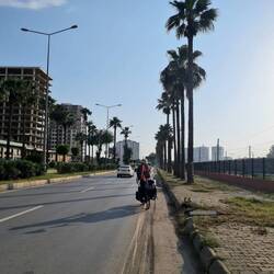 Claudia wird am Morgen davon wach, dass irgendetwas laut des Abhang zu unserem Zeltplatz hinunterpoltert. Der erste Verdacht, dass es sich um einen Traktor handeln könnte, bestätigt sich nicht und wäre bei etwas logischem Nachdenken auch gar nicht möglich gewesen. Der Blick aus dem Zelt offenbart, dass stattdessen eine Schafherde die kleine steile Rampe runtergetrieben wird. Schnell Heiko wecken, denn es dauert nicht lang, bis auch die bellenden Hunde und der freundliche Hirte unser Zelt erreichen. Letzterer möchte uns zum Frühstück zu seinem Haus einladen, was Heiko aber dankend ablehnt und den Kocher für die Zubereitung unserer morgendlichen Heißgetränke anwirft. Es dauert keine zehn Minuten, da steht der Hirte wieder vor unserem Zelt und informiert uns darüber, dass seine Mutter bereits das Frühstück vorbereitet. Also gut: Kocher wieder aus, Sachen packen, Zelt abbauen, Räder beladen...! Der Hirte sitzt etwas abseits im Gras und wartet geduldig, bis wir fertig sind. Im seinem und dem Geleit von einer Herde Schafen und zwei Hunden marschieren wir schließlich zum 400m entfernten Hof. Neben der mähenden Schafherde muhen auch Kühe und gackern Hühner auf dem Gelände, über unseren Köpfen schwirren und zwitschern reichlich Schwalben und Spatzen. Wir lernen die Mutter des Hirten kennen, die uns vor dem Haus ein herrliches Frühstück mit Brot, Schafskäse, eingelegten Oliven von eigenen Bäumen, gekochten Eiern und natürlich Tee serviert. Heiko hat in der Nacht neben bellenden Hunden auch ein Heulen gehört, jetzt erfahren wir, dass diese Laute wohl von Schakalen stammen. Außerdem berichtet der Hirte von etwa 60 Wildschweinen, die hier im Umkreis unterwegs sind. Da die Tiere das Getreide zerstören, werden sie geschossen und angesichts des Umstandes, dass Türken kein Schweinefleisch essen, an Chinesen verkauft, die in unmittelbarer Nähe ein Kraftwerk betreiben. Als wir dem Hirten auf Nachfrage unsere weitere Roure zeigen, empfiehlt er uns eine Änderung. Auf der von ihm empfohlenen Strecke sei weniger Verkehr und es sei insgesamt schöner als auf der von uns vorgesehenen Route, die wohl an einem Kraftwerk vorbeiführt und stark von LKW frequentiert wird. Wir folgen der Empfehlung, die sich auch als absolut richtig erweist. In der Ferne sehen wir deutlich die Rauschschwaden der Industrieanlagen, von denen wir auf der Nebenstraße (noch) verschont bleiben. In einem winzigen Dorf legen wir eine kleine Rast an einer Bushaltestelle ein. Inzwischen war unsere Entscheidung gefallen, durch die Region Hatay zu fahren. An der Beschriftung der Bushaltestellenbänke erkennen wir nun, dass die Provinz Adana hinter uns liegt und das Dorf bereits zu Hatay gehört, wo in der Nacht auf den 06. Februar 2023 die Erde bebte. Der Gedanke, dass durch dieses verheerende Erdbeben hier im letzten Jahr tausende Menschen ihr Leben und unzählige ihr Zuhause mit allem Hab und Gut verloren haben fährt fortan mit. Während wir hier noch so sitzen, kommt ein junger Mann vorbei und stellt interessierte Frage. Ein Viertelstündchen später taucht er erneut auf, um uns eine große Tüte voll mit Orangen zu schenken. Mit reichlich Vitamin C im Fahrradkörbchen radeln wir weiter und erreichen kurz darauf die Hauptstraße, der wir nun bis zum Zielort İskenderun nicht mehr entkommen können. Viel lauter Verkehr, vor allem LKW, braust an uns vorbei und der erste Mittelmeerblick (wir sind nur einen Steinwurf von der Küste entfernt...) wird durch mächtige Industrieanlagen in der Freihandelszone verhindert. Kurz vor Erreichen der Stadt können wir dann doch noch einen Blick auf das Mittelmeer erhaschen, wenn dieser auch bei weitem nicht so grandios und besonders ist wie der bei Erreichen des Schwarzen Meeres im letzten Jahr. Mit der Einfahrt in İskenderun sind dann auch für uns erstmals die durch das Erdbeben angerichteten Folgen nicht mehr zu übersehen: Lücken, wo einst Häuser standen, zerstörte Gebäude, nach wie vor Container- und Zeltunterkünfte in der Stadt. In zentraler Lage liegt das Diamond Palace Hotel, wo wir gegen 19 Uhr einchecken. Unser Zimmer ist sehr groß und geräumig, darüber hinaus aber eher "mittelmäßig". Im letzten Abendlicht zieht es uns nach einer Dusche noch einmal hinaus an die Promenade. Wir besuchen einen bedeutenden Platz der Stadt, den