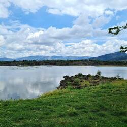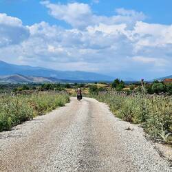 Als wir am Morgen aufstehen, ist der Familienvater bereits wieder bei der Arbeit und einige Kinder schon in der Schule, Zeynep und Betül verabschieden sich gerade und verlassen das Haus. Sultan verzichtet heute auf den Schulbesuch, weil wir da sind, wie sie uns erklärt. Ein wunderbares Frühstück genießen wir noch in diesem gastfreundlichen Haus, bevor die Zeit des Aufbruchs gekommen ist. Sultan zeigt uns noch kurz die zwei Kühe der Familie und wie üblich wird noch das eine oder andere Foto gemacht. Ein bisschen bereuen wir, nicht gestern schon ein gemeinsames Bild gemacht zu haben, wo am heutigen Morgen diverse Familienmitglieder leider nicht mehr da sind. Zum Abschied werden uns noch reichlich Geschenke überreicht: Neben Socken für uns beide gibt es zwei Gläser Oliven, ein Glas Sesampaste, Kuchen und reichlich Sesamkekse alles aus eigener Produktion…! Wir verstauen alles in den Packtaschen, verabschieden uns und radeln schließlich winkend vom Hof. Ein paar kleine Wattewölkchen zeigen sich am ansonsten blauen Himmel, als wir wieder über den Asphalt rollen. Nach etwa drei Kilometern erreichen wir den Ort Aktepe, wo wir unsere Wasservorräte auffüllen. Es ist ein sehr quirlig lebendiger Ort. Rechts und links der Straße herrscht emsiges Treiben, während auf dem Mittelstreifen viele Menschen auf kleinen Holzstühlen unter Palmen sitzen und Tee trinken. Nachdem Aktepe hinter uns liegt, werden wir doch etwas überrascht von der Landschaft die uns nun erwartet. Auf einmal befinden wir uns inmitten riesiger Lavafelder, die gespickt sind mit kleinen Olivenbäumchen. Eine Recherche zu dieser Gegend in der Provinz Hassa ergibt, dass wir hier in einer Ova („Landschaft, Ebene“) tektonischen Ursprungs unterwegs sind, die in seismisch aktiven Teilen der Türkei vorkommen. Der durch Hassa ziehende Antakya-Kahramanmaraş-Graben ist ein Gebiet, in dem verschiedene tektonische Strukturen nebeneinander existieren und die tektonische Aktivität sehr intensiv ist. Auf beiden Seiten des Grabenfeldes existieren Verwerfungslinien. Während die Verwerfungszone des Toten Meeres den östlichen Teil der Grabenlinie begrenzt, begrenzt die ostanatolische Verwerfungszone den westlichen Teil des Grabens. Fasziniert radeln wir durch die an Island erinnernde „Mondlandschaft“, durch die auch die eine oder andere Ziegenherde getrieben wird. Die heutige Etappe konfrontiert uns aber mit noch einer weiteren Besonderheit, nämlich der unmittelbaren Nähe zur syrischen Grenze. Diese Tatsache stimmt uns angesichts der Lage in diesem Land mal wieder nachdenklich und die Brisanz dieses Grenzgebietes wird durch folgende Begegnung verdeutlicht: Der Fahrer eines Traktor fährt hinter uns her und hält an, um uns davon abzuhalten, dieser Straße weiter zu folgen. In der Richtung würde es nach Syrien gehen und wir sollten unbedingt umkehren und einen anderen Weg einschlagen. Er gibt uns einen Tipp, wie wir am besten zu einer größeren Straße gelangen, der wir dann über die Stadt Kilis nach Gaziantep folgen können. Obwohl laut unseren Navis die von uns gewählte Strecke lediglich parallel zur Grenze verläuft und die empfohlene Route auf den Geräten gar nicht verzeichnet ist, vertrauen wir dem sehr eindringlich formulierten Rat des Traktorfahres und folgen einer kleinen Straße durch die Lava. Als wir ein kleines Dorf erreichen und in einem Laden Wasser kaufen wollen, werden wir direkt von drei Männern zum Tee eingeladen. Auch sie erwähnen, dass wir an dieser Stelle nur drei Kilometer von der syrischen Grenze entfernt sind und bestätigen die Empfehlung der Route über Kilis nach Gaziantep. Um uns auf den rechten Pfad zu bringen, begleitet uns einer der Männer auf seinem Moped ein Stück des Weges. Wieder zu zweit erreichen wir nach einer Weile eine Kreuzung, an der wir eine Entscheidung hinsichtlich der weiteren Fahrt treffen müssen. Biegen wir auf die Hauptstraße ab und radeln auf direktem Weg über Kilis weiter nach Gaziantep oder überqueren wir die Kreuzung, um wieder auf unsere ursprünglich geplante Route zu stoßen, um dieser zu folgen? Während wir diesbezügliche Überlegungen anstellen, kommen mehrere Menschen aus einem sich in Sichtweite befindlichen Zeltlager mit Eimern und anderen Gefäßen vorbei, um auf der gegenüberliegenden Straßenseite an einem Brunnen Wasser zu holen. Bei diesem Lager scheint es sich nicht um eine Unterkunft für Erdbebenopfer zu handeln, ohne es genau zu wissen vermuten wir eher ein syrisches Flüchtlingscamp. Wir entscheiden uns schließlich gegen die verkehrsreiche Hauptstraße und für die weitere, aber vermutlich ruhigere Nebenstrecke, die auf unseren Navis gespeichert ist. Mittlerweile ist die Zeit auch so weit fortgeschritten, dass die Suche nach einem Zeltplatz eingeläutet werden sollte. Die eine oder andere Option wird inspiziert, aber irgendwie kann Heiko sich nicht mit dem Gedanken anfreunden, hier die Nacht zu verbringen. Manchmal ist es einfach so, dass man sich aus rational nicht erklärbaren Gründen in einer Umgebung nicht wohlfühlt, so geht es Heiko hier und heute. Obwohl die Landschaft total schön ist und faktisch eigentlich nichts anders ist als sonst, passt einfach das Gefühl nicht. Da es aber wichtig ist, dass wir uns stets beide wohlfühlen, beschließen wir, heute auf eine Übernachtung im Zelt zu verzichten und einen kleinen Umweg zu einem Hotel in Kauf zu nehmen. Das übliche Päuschen findet natürlich trotzdem statt, schließlich muss ja auch der geschenkte Kuchen verzehrt werden. Nicht weit vom Ziel entfernt durchqueren wir ein Weinanbaugebiet, wo wir einen deutschsprachigen Türken treffen. Er erzählt uns, dass er durch das Erdbeben sein Haus verloren hat und sich daraufhin eine Hütte auf seinem Weinfeld gebaut hat, was eigentlich nicht erlaubt ist. In der Ferne können wir bereits die gleichförmigen großen Häuser an unserem Zielort İslahiye ausmachen. Je näher wir kommen, desto deutlicher erkennen wir, dass hier riesige ne