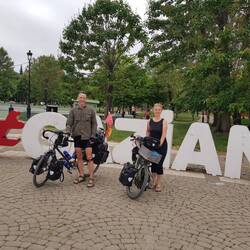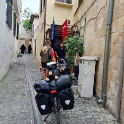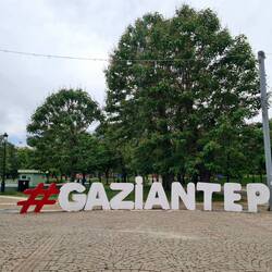 dem letztmaligen Aufbau unseres mobilen Esszimmers standesgemäß die letzten "Gipfelchips“ vernichten. Am Horizont ist die Silhouette von Gaziantep auszumachen, als wir die knisternden Tüten leeren und Heißgetränke schlürfen. Wir nehmen die letzten Kilometer in Angriff, unser Weg führt uns nun erwartungsgemäß durch zunehmend besiedelte Gegenden. Gegen Mittag rollen wir dann in die sechstgrößte Stadt der Türkei mit etwas mehr als 2 Millionen Einwohnern, Gaziantep ist erreicht. Während wir uns von den Navigationsgeräten zum vorab gebuchten Hotel lotsen lassen, knacken wir nebenbei noch die Marke von 10.000 Kurs-Südost-Radelkilometern. Am Demokrasi Meydanı halten wir kurz an, um vor den großen weißen Buchstaben, die den Namen Gaziantep bilden, ein "We did it"-Foto zu machen. Durch die engen Gassen der Altstadt schlängeln wir uns anschließend zum Şirvani Konağı Butik Otel. Im hübschen Innenhof des altehrwürdigen und ziemlich verwinkelten Gebäudes dürfen wir unsere Räder abstellen und bekommen einen Tee serviert. Nach Bezug unseres Zimmers wollen wir nicht viel Zeit verlieren, sondern zügig die eher lästigen, aber notwendigen Abreisevorbereitungen in Angriff nehmen. Eine Dusche genehmigen wir uns noch, dann machen wir uns auf den Weg. Ein Fahrradgeschäft ist unser Ziel, wo wir hoffentlich große Kartons zum Verpacken unserer Räder ergattern können. Im ersten Geschäft kann man uns zwar den Wunsch nicht erfüllen, aber die Mitarbeiter sind dennoch sehr hilfsbereit. Ein Herr nimmt telefonisch Kontakt zu einem anderen Fahrradladen auf, sichert uns zwei Kartons zu und erklärt uns den Weg. Nach zwei Kilometern Fußmarsch erreichen wir das Geschäft und erhalten auch prompt die gewünschte Ware, perfekt! Das Tragen zu zweit erweist sich als nicht wirklich praktikabel, so dass Heiko schließlich allein die ineinander gesteckten riesigen Kartons abwechselnd auf Kopf und Schulter durch die Straßen zum Hotel balanciert, während Claudia auf Hindernisse und Verkehr achtet. Froh über den Erfolg widmen wir uns nun wieder den angenehmen Dingen des Lebens. Eine gewisse Vorfreude hatte sich bereits eingestellt, als wir folgendes gelesen haben: "Die antike anatolische Stadt Antep, heute bekannt als Gaziantep, gilt als die gastronomische