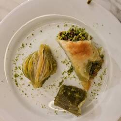 muss unbedingt getestet werden! In einem nicht weit vom Hotel entfernten Restaurant probieren wir uns erst durch eine Auswahl empfohlener traditioneller Köstlichkeiten und genehmigen uns danach ein paar Straßen weiter eine üppige Portion Baklava. Satt und zufrieden beenden wir den heutigen Tag...Læs mere