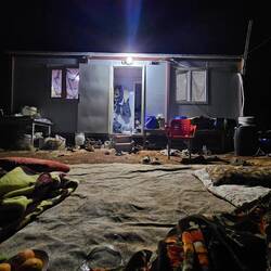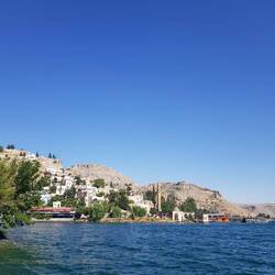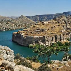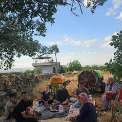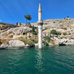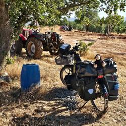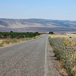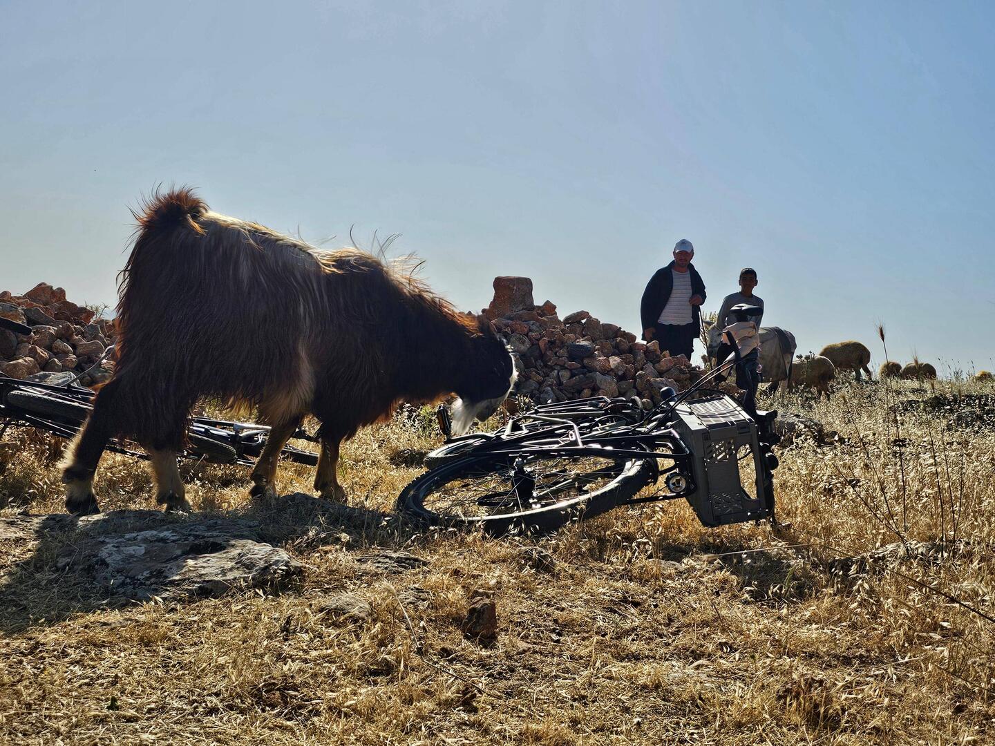 Beim morgendlichen Frühstück im Zelt bleiben wir nicht lange allein. Ein Hirte und sein Sohn tauchen mit ihrer Schaf- und Ziegenherde sowie zwei Hunden und zwei Eseln auf. Sie verweilen kurz bei uns und inspizieren sehr interessiert unsere Fahrräder (Menschen und Tiere!). Wir erfüllen dem Sohn seinen Wusch, Claudias Fahrrad zu fahren, das Gegenangebot eines Eselrittes schlagen wir allerdings aus. Zu Beginn unserer heutigen Etappe dürfen wir zunächst einige Kilometer bergab rollen. Leicht hügelig geht es weiter, angesichts der hohen Temperaturen wird dennoch jede Steigung zu einer schweißtreibenden Angelegenheit. Als wir den höchsten Punkt vor Erreichen der Römerfestung "Rumkale" erreichen, für die wir einen kleinen Abstecher in Kauf nehmen, lassen wir uns auf einer überdachten und folglich schattenspendenden Bank nieder. Um Rumkale zu erreichen, müssten wir ca. 230hm auf einer Strecke von 3km erst abwärts und nach Besichtigung auf selber Strecke zurück bergauf radeln. Heiko hatte bereits zu Hause die Idee, die Räder hier im Ort Beğendik zu lassen und den Rumkale-Ausflug zu Fuß in Angriff zu nehmen. Kaum sitzen wir auf der Bank, kommt ein älterer Herr aus dem Haus gegenüber und versorgt uns mit einer großen Kanne kaltem Ayran. Wir verpassen leider die Chance, ihn zu fragen, ob wir unsere Räder für ein paar Stunden auf seinem Hof abstellen dürfen. Obwohl wir mehrfach auf sein Grundstück spähen, sehen wir den Mann nicht wieder, auch ansonsten scheint das kleine Dorf ziemlich ausgestorben. Als wir noch recht ratlos auf der Bank hocken, knattern zwei mit vielen Menschen beladene Trecker heran und steuern das Tor zu einem Grundstück neben unserer Pausenbank an. Bei einem der Trecker wird die Rückwärtsgang eingelegt und das Gefährt kommt neben uns zum Stehen. Der Fahrer spricht uns an und möchte uns zum Essen einladen. Mit Hilfe seines in Berlin lebenden Neffen, den er zum Dolmetschen anruft, können wir unseren Wunsch äußern, zunächst Rumkale zu besuchen und unsere Räder währenddessen sicher untergebracht zu wissen. Problem yok - kein Problem heißt es wie erwartet. Zudem besteht der Mann, dessen Namen wir leider vergessen haben, darauf, uns die drei Kilometer zum Ziel im Auto zu chauffieren. Widerrede zwecklos! Wir schieben also unsere Fahrräder durch das Grundstückstor und stellen sie ab, packen noch ein paar Kleinigkeiten im unsere Rucksäcke uns schon sitzen wir im unserem ganz privaten Taxi. Als wir am Parkplatz abgesetzt werden, gibt unser Fahrer einem Mann vom Wachpersonal noch seine Telefonnummer, dieser solle sich melden, wenn wir wieder abgeholt werden. Was für ein Service! Wir beginnen unsere Erkundung mit einem Gang auf eine große gläserne Aussichtsterrasse, von welcher man einen großartigen Blick auf den Fluss Euphrat und Rumkale hat. Die Lage der byzantinischen Burg auf den Klippen rund um die Flusshalbinsel ist spektakulär. Als wir uns von oben satt gesehen haben, marschieren wir hinunter an den Fluss, um im Rahmen einer Bootstour auch die wasserseitige Perspektive zu genießen. Wir schippern nicht nur an Rumkale vorbei, sondern auch an der im Euphrat versunkenen Stadt Halfeti. Zunächst fahren wir entlang des alten Halfeti, wo das Minarett der Moschee noch immer aus dem Fluss herausragt. Im erhaltenen Teil von Halfeti legen wir an und haben eine halbe Stunde Zeit an Land für einen Rundgang, bevor es zurück zum Ausgangspunkt geht. Zurück am Parkplatz ist der Wachmann schnell gefunden, der uns auch gleich erkennt und unseren Fahrer anruft. Bereits wenige Minuten später befinden wir uns wieder auf seinem Grundstück und sitzen mit der Familie zusammen. Auf dem großzügeigen Areal steht eine Art Wohncontainer und abseits davon ein winziges WC-Gebäude. Wir erfahren, dass das Haus der Familie in diesem Dorf durch das Erdbeben 2023 zerstört wurde. Es gibt wohl noch ein weiteres Haus in Gaziantep, dennoch müssen hier vor Ort die Pistazienfelder bewässert werden. Genau das macht auch unser Gastgeber, während wir von seiner Frau und seiner Schwägerin mit reichlich köstlichem Essen und natürlich Tee versorgt werden und Bilder von unserer Familie zeigen. Irgendwann kommen die Männer von der Arbeit zurück und ein Teil der Familie verabschiedet sich. Wir sitzen schließlich mit unserem Gastgeberehepaar und deren Kindern vor dem Haus auf dem Boden und dürfen schon wieder essen. Ein sehr leckeres Abendessn und Ayran, im Anschluss Tee, türkischer Kaffee und Baklava wird serviert. Am Ende stellt sich nur noch die Frage, wo wir heute schlafen werden. Eine Einladung zur Übernachtung auf dem Grundstück wurde bereits ausgesprochen, unser Zelt sei nicht nötig, man würde uns ein Bett machen. Es stellte sich uns bloß die Frage: Wo? In dem winzigen Container ist mit Sicherheit kein Platz. Nach dem Essen sind wir schlauer, denn es entsteht ein Schlafzimmer unter freiem Himmel. Nur die Kinder nächtigen im Container, die Eltern schlafen draußen und wir teilen heute das Nachtlager mit ihnen. Gut gepolstert und unter warmen Decken schauen wir in die Sterne und beenden diesen Tag.Read more