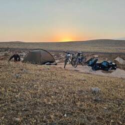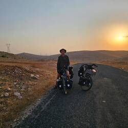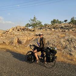 Die Ausfahrt aus der Stadt gestaltet sich deutlich entspannter als die Einfahrt vor zwei Tagen, nach etwa 8 Kilometern sind die Ausläufer der Millionenmetropole erreicht. Eigentlich hatten wir vor, einen Schlenker über die antike Stadt Harran zu fahren, die südöstlich von Şanlıurfa kurz vor der syrischen Grenze liegt und für ihre bienenstockähnlichen Lehmbauhäuser berühmt ist. Wir verwerfen diese Idee, da es nach wie vor extrem heiß ist. Stattdessen begeben wir uns auf die direkte Route nach Mardin, auf welcher tatsächlich auch schon die Stadt Habur im Irak ausgeschildert ist. Es ist zwar schade, dass wir Harran nicht sehen werden und nun ein erheblicher Abschnitt auf der Hauptstraße vor uns liegt, aber an dieser Stelle muss einfach die Venunft siegen. Der Vorteil und unsere Hoffnung ist, dass wir so schneller das heiße Gebiet Mesopotamiens verlassen und etwas kühlere Regionen erreichen werden. Der erste Pausenwunsch des Tages führt uns mal wieder an eine Tankstelle. In netter Gesellschaft freundlicher Herren, von denen einer recht gut englisch spricht, kühlen wir uns im Schatten mit kalten Getränken etwas ab. Nachdem wir uns dann erneut für einige Zeit dem Lärm der Hauptstraße ausgesetzt haben, wollen wir uns einen ruhigen Platz, am besten im Schatten großer Bäume, abseits der Straße suchen, um der Mittags- und Nachmittagshitze zu entkommen. Tatsächlich finden wir das ersehnte ruhige Fleckchen und freuen uns schon auf die ausgiebige Pause. Diese Rechnung haben wir aber mal wieder ohne die gastfreundlichen Einheimischen gemacht. Als wir gerade unsere Räder abstellen und unsere Stühle aufstellen wollen, spricht uns ein Mann an, der hier mit seinen zwei Kühen, oder vielmehr Kälbern, unterwegs ist. Er lässt nicht locker, bis wir uns von ihm auf sein nahegelegenes Grundstück einladen lassen. Die Kälber traben vorweg, wir rumpeln das kleine Stück bis zum Haus hinterher. Wir dürfen an einem Tisch im großzügigen Garten Platz nehmen und bekommen Tee serviert. Wenige Meter von uns entfernt backt die Frau unseres Gastgebers mit zwei Töchtern Brot. Während die Mutter und eine Tochter auf dem Boden sitzend den Teig zu großen flachen Fladen ausrollen, backt die zweite Tochter diese Fladen über dem offenen Feuer. Wir erfahren, dass unser Gastgeber nicht nur diese eine Frau hat, sondern noch eine zweite, die nebenan wohnt, zudem habe er insgesamt zwanzig Kinder. Es wird schnell klar, dass es hier nicht bei einem Tee bleibt. Als der Teig sich in einen riesigen Berg Fladenbrote verwandelt hat, wird ein Essen vorbereitet. Wir lassen indes den Blick durch den Garten streifen. Gemüse wird angebaut, Hühner und Gänse laufen hier rum, außerdem weitere Kühe. Eines der Hühner habe unser Gastgeber lange aufpäppeln müssen, nachdem es von einer Schlange in den Hals gebissen worden war. Auch kümmert er sich um vier sehr niedliche Hundewelpen, deren Mutter überfahren wurde. Während wir dann ein sehr leckeres Gericht mit Reis, Auberginen, Fleisch und Salat essen, kommt noch ein deutsch sprechender Freund der Familie dazu. Er ist Rentner und kann nun entsprechend viel Zeit in der Türkei verbringen. Er war in Deutschland als LKW-Fahrer beschäftigt, wohnt aktuell im Ort Gescher in NRW, hat aber tatsächlich auch mal drei Jahre in Eckernförde gelebt und ist auch mehrfach in Kiel gewesen. Als unser Gastgeber uns nach dem Essen einen Teppich im Garten ausrollt, damit wir uns hinlegen können, beschließen wir, doch eher den geordneten Rückzug anzutreten. Wir bedanken uns für die Gastfreundschaft und machen uns wieder auf den Weg. Nach wie vor ist es sehr heiß, weshalb wir den nächsten geeigneten Schattenplatz für eine Fortsetzung unserer Pause, diesmal gerne in trauter Zweisamkeit, ansteuern. Schatten finden wir nach etwa vier Kilometern, so richtig allein sind wir aber nicht. Zwei kleine Kinder auf Dreirädern machen Faxen mit uns (oder wir mit ihnen...), ein Mann schaut vorbei und will uns in sein Haus einladen und eine alte Frau, die wir leider nicht verstehen können, schenkt uns eine Tüte mit zwei Lahmacun. Wir verweilen nicht allzu lange an diesem Ort, recht bald geht es zurück auf die Hauptstraße, unterbrochen nur noch von einer kurzen Tankstellen-Rast und einer Tee-Pause am Straßenrand. Wir freuen uns, als wir dann die Hauptstraße verlassen dürfen. Auf einer kleinen Nebenstraße wartet zum Abschluss des Tages noch ein Anstieg auf uns. Wir radeln aufwärts und freuen uns über die Stille, endlich kein Dauerrauschen der Autos und LKW mehr, hoffentlich wird das auch für unser heutiges Nachtlager zutreffen. Durch karge und zunehmend vegetationarme Landschaft führt unser Weg, Schafherden sind unterwegs, die Abendsonne taucht die Berge in herrliches Licht. Kurz hinter dem Gipfel finden wir ihn, unseren einsamen, stillen Zeltplatz. FAST einsam und FAST still, wie sich dann doch herausstellt. Mehrfach bekommen wir Besuch von einigen jungen Männern, die uns unbedingt einladen möchten. Der zweite Besuch sei im Auftrag ihres Vaters erfolgt, der unbedingt sichergestellt haben möchte, ob wir nicht doch etwas brauchen. "Danke, sehr nett, wir brauchen nichts, wir haben alles, ja, wir haben auch Wasser und etwas zu essen und wir schlafen gerne im Zelt...!" Als die Jungs irgendwann überzeugt waren, dass es uns wirklich an nichts fehlt, brausen sie davon und wir genießen Sonnenuntergang und STILLE.Leia mais