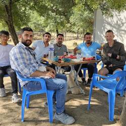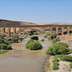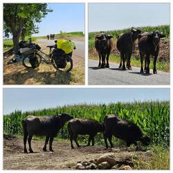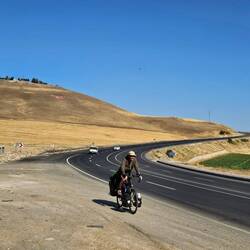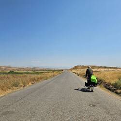 Da es aber auch ohnehin kaum ein Fleckchen Schatten hier oben gibt, begeben wir uns ohne Pause abwärts. Einen sehr freundlichen Empfang erfahren wir, als das steilste Stück der Abfahrt hinter uns liegt. Ein paar Bauarbeiter winken uns heran und bitten uns an ihren Tisch. Mundgerecht geschnittene Wassermelone liegt schon bereit, dazu bekommen wir noch Brot, Käse und natürlich Tee serviert. Als die Jungs wieder ihrer Arbeit nachgehen müssen, rollen wir weiter, erst noch ein Stück bergab, dann eine Weile auf recht ebener Strecke. Im kleinen Ort İkiköprü erledigen wir einen Einkauf und wollen dann zur Abwechslung mal einen Pausenplatz finden. Wie schon des öfteren gestaltet sich die Suche nicht ganz einfach angesichts der Tatsache, dass große Bäume und somit auch Schatten sehr, sehr rar sind in dieser Gegend. Irgendwann entdecken wir aber am Straßenrand dann doch noch ein paar Bäumchen, die uns Sonnenschutz bieten. Die Aussicht ist toll: Die Flußnähe ermöglicht rege landwirtschaftliche Nutzung, so dass anders als sonst viel sattes Grün zu sehen ist. Im Hintergrund heben sich die beige-braunen, von der Sonne angestrahlten Berge ab, weiter entfernt am Horizont lässt sich eine weitere, höhere Bergkette erahnen. Schön! Gerne hätten wir etwas abseits der Straße pausiert, um etwas Ruhe vor Autos und Menschen zu haben, aber man muss es wohl nehmen, wie es kommt. Und wie sollte es anders sein: Da kommt so Einiges. Nicht gerechnet hatten wir damit, dass drei Wasserbüffel auf der Straße herangetrottet kommen. Mindestens genauso wenig haben die Tiere ganz offensichtlich mit uns gerechnet, ziemlich verdutzt schauen sie uns an, bleiben stehen und trauen sich scheinbar nicht vorbei. Nach einigem Zögern entscheiden die drei Büffel sich für einen Umweg durch das gegenüberliegende Maisfeld. Sie verschwinden in dem hochgewachsenen Mais, nur noch das eine oder andere brummende Muhen hören wir. Einer der drei Büffel steckt noch zweimal den Kopf durch die Halme und späht zu uns hinüber, dann verschwindet auch er raschelnd im Feld. Die nächste Begegnung ist ein freundlicher Herr, der mit seinem Auto anhält und uns eine riesige Wassermelone schenkt. Das Auto ist schon wieder in Bewegung, da hält er erneut an und schenkt uns eine zweite, ebenso große Melone. Das ist natürlich total nett und Melonen sind ja auch ausgesprochen köstlich, aber die eingeschränkte Transportkapazität auf einem Fahrrad scheint den Einheimischen nicht wirklich bewusst zu sein. Eine der Melonen "schlachten" wir einfach sofort und löffeln jeder eine Hälfte aus. Ein weiterer Mann parkt sein Auto am Straßenrand und zeigt sich sehr gesprächsfreudig. Unter anderem berichtet er, dass er vor dreißig Jahren in Deutschland in Garmisch-Partenkirchen gearbeitet habe. Mehrfach verabschiedet er sich von uns und geht zu seinem Auto, kommt aber jedes Mal wieder zurück, weil er noch etwas erzählen oder uns noch einen guten Rat geben möchte. Parallel gesellt sich ein weiterer Mann zu uns, der sich partout nicht damit zufrieden geben möchte, dass wir mit allem versorgt sind und nichts brauchen. Als er erfährt, dass sich kein Käse in unseren Packtaschen befindet, ist sein Auftrag klar und er setzt sich in sein Auto und düst davon. Der erste Besucher ist derweil immer noch da und erzählt, der er in der Textilbranche tätig sei. Er öffnet den Kofferraum seines Transporters, der bis unter das Dach mit Kleidung gefüllt ist. Nach einigem Suchen in diversen großen Tüten hält er drei T-Shirts in den Händen, die er uns schenken möchte. Die Kleidungsstücke sehen eher nach Kindergröße aus, aber er präsentiert uns eindrücklich, wie dehnbar das Material ist. Nun gut, vielleicht können wir die neuen Klamotten ja neben der Wassermelone verstauen, wir haben ja Platz...! Apropos Wassermelone: Der Mann, der mit dem Auto weggefahren ist, kommt zurück und übergibt uns Brot, reichlich Käse uuuund eine halbe Wassermelone. Als wir (endlich) wieder zu zweit sind, hoffen wir inständig, dass weitere Besuche (und Wassermelonen) erstmal ausbleiben. Wir haben Glück, es wird allenfalls noch aus vorbeifahrenden Autos gewunken. Die einzigen Lebewesen, die erneut auftauchen, diesmal aus der anderen Richtung, sind die drei Wasserbüffel. Auch aus dieser Richtung sind wir ihnen nicht geheuer. Mit gehörigem Abstand bleiben sie am Straßenrand stehen, bis sie dann doch noch von einem Bauern "abgeholt" werden. Beladen mit neuer Kleidung und 1,5 Wassermelonen fahren wir nach unserer ausgedehnten Rast nicht mehr weit. Der Weg führt durch ein großes Anbaugebiet für Mais und Tabak. Die Pflanzen werden ausgiebig bewässert, die Felder werden regelrecht von extra angelegten Wassergräben umspült. Dieser Umstand macht die Zeltplatzsuche nicht einfacher, wollen wir doch gerne trocken bleiben. Am Ende verschlägt es uns auf der langen Mais- und Tabakstraße wie schon so oft auf ein Stoppelfeld. Sobald das Zelt steht, verkriechen wir uns, um vor den penetranten Mücken sicher zu sein, geschätzt sind es Millionen...Lue lisää
