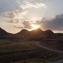 Eine Dreiviertelstunde später sitzen wir auf den Rädern (Kocher, Klappstühle, Proviant, umfangreiches Kameraequipment und acht Liter Wasser an Bord) und machen uns an den langen Anstieg. Schon, als wir um halb elf (ganz schön spät für so eine Aktion…) die Hauptstraße von Tatvan in westlicher Richtung zum Ortsausgang rollen, baut sich der Zielberg gewaltig und respekteinflößend in der Ferne auf.