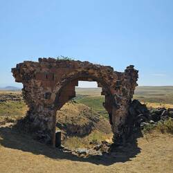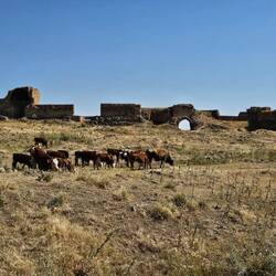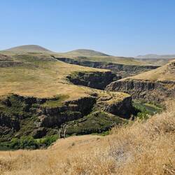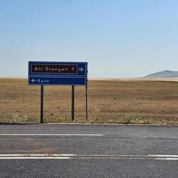 Es ist noch nicht mal neun Uhr, als wir unser geplantes Sightseeing-Ziel für heute, die antike Stadt Ani, erreichen. Die historische Stätte öffnet um neun, der große Besucherparkplatz ist noch herrlich leer. Unsere Fahrräder dürfen wir netterweise mit auf das Gelände nehmen und direkt neben dem Ticket-Office parken, wo wir dann zwei Eintrittskarten kaufen. Gerne hätten wir im Café im Eingangsbereich des großen Besucherzentrums noch etwas getrunken, leider findet sich aber hinter den Scheiben des Kühlschranks nur gähnende Leere. Komisch, denken wir, so ein großes Café mit Innen- und Außenbereich, aber nicht mal Wasser ist vorrätig. Aber was soll's, dann beginnen wir eben direkt mit der Besichtigung. Ani war einst armenische Hauptstadt, ist aber seit vielen Jahrhunderten verlassen. Die Ruinen befinden sich rund 42 Kilometer in südöstlicher Richtung entfernt vom Endpunkt unserer diesjährigen Reise, der Stadt Kars, entfernt.