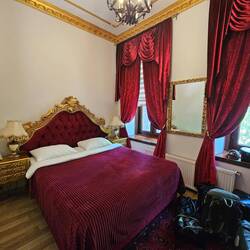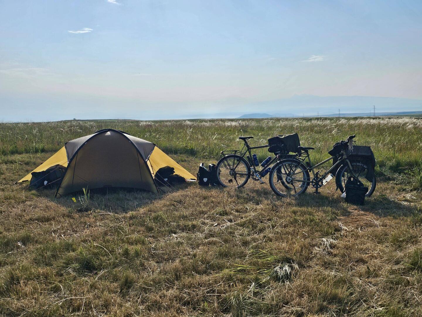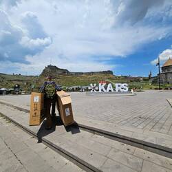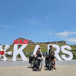Wie üblich stehen wir mit der Sonne auf, lassen uns aber ziemlich viel Zeit und sitzen erst um halb neun im Radsattel. Es ist ein wunderschöner Morgen. Die Sonne scheint, die Luft ist nach reichlich nächtlichem Regen sehr gut und die Temperaturen sind zu dieser Tageszeit noch sehr angenehm. Am Wegesrand blühen Wiesenblumen in den unterschiedlichsten Farben, flauschige Hummeln tummeln sich in leuchtend-pinken Disteln. Die letzten Höhenmeter dieses Urlaubes sind schnell bezwungen, dann rollen wir geradewegs ans Ziel. Über zwanzig Kilometer erstreckt sich die sanfte Abfahrt in die Stadt Kars. Hier steuern wir in der Hoffnung, große Kartons zu ergattern, zuallererst ein Fahrradgeschäft an. Der Ladenbesitzer bejaht die Frage nach Kartons zu unserer Freude sofort und lädt uns auch direkt zum Kaffee an. Er hatte zunächst angenommen, dass wir auch die Verpackung der Räder durch ihn wünschen, dieses Missverständnis lässt sich aber aufklären. Wir verabreden, dass wir zu unserem Hotel fahren und in etwa zwei Stunden zurückkommen und die Kartons abholen. Zu unserer Unterkunft ist es nicht mehr weit, etwas versteckt liegt das Hotel Katerina Sarayı, ein historisches Gebäude aus der russischen Besatzungszeit von Kars, am Fuße des Festungsberges direkt am Flussufer. Was das Radeln angeht, heißt es jetzt und hier: Mission completed! Wir werden sehr freundlich empfangen, beziehen unser Zimmer, welches von rotem Samt und goldenen Verzierungen dominiert wird, und unterziehen uns einer gründlichen Dusche. Frisch und sauber spazieren wir zurück zum Fahrradgeschäft, um die Kartons abzuholen, unterwegs können wir auch noch das für die Verpackung nötige Klebeband und eine Tüte Kabelbinder ergattern. Zurück am Hotel sind wir etwas besorgt, da wieder dunkle Wolken am Himmel zu sehen sind und ein schützender Unterstand oder ähnliches auf dem Hotelgelände nicht zu sehen ist. Das Personal des Hotels hat aber sofort eine Lösung parat. In einer Mischung aus Vorratsraum und Personalküche in einem Nebengebäude wird Platz geschaffen, damit Heiko hier trocken und in Ruhe die Fahrräder flugttauglich verpacken kann. Am frühen Abend ist die lästige Pflicht erledigt und die Abreise so weit es geht vorbereitet. Das gibt uns die Möglichkeit, den morgigen Tag zum Sightseeing zu nutzen. Der heutige Tag klingt mit einem eher mäßigen Essen im Laden einer Kebab-Restaurantkette, etwas Straßenmusik auf dem Rückweg zum Hotel sowie Schokolade und Tee im Zimmer aus.Read more