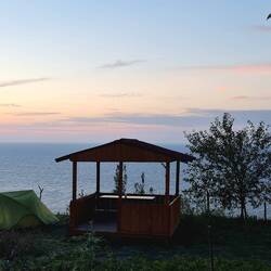 Aber auch während des Radelns genießen wir die Landschaft in vollen Zügen, zu unserer Linken dicht bewaldete Berge und zu unserer Rechten felsig-schroffe Steilküste und zwischendurch kleine idyllische Strandbuchten vor dem in der Sonne leuchtenden Meer. Hinter jeder Kurve eröffnet sich eine neue Aussicht, immer wieder halten wir an, um Fotos zu machen oder einfach nur zu genießen. Man kann kaum mit Worten beschreiben, wie atemberaubend schön diese Gegend ist. Sollte diese Worte also jemand lesen: Ab an die Schwarzmeerküste! Gegen halb fünf mit guten 1000hm in den Beinen wollen wir so langsam den Feierabend einläuten, es fehlt nur an einem kleinen ebenen Fleckchen Wiese oder dergleichen für unser Zelt. Links geht es steil die Berge rauf, rechts bietet die Steilküste keinen Platz. Und als wir dann doch eine geeignet scheinende wilde Wiese entdecken, steht in unmittelbarer Nähe ein Haus. Wir hören Menschen und denken uns: Fragen wir doch einfach! Und dann geht plötzlich alles ganz schnell. Die Leute vor dem Haus begrüßen uns freundlich, als von der Straße ein Auto auf das Grundstück abbiegt. Frauen und Kinder steigen aus und reden sehr laut und aufgeregt, dabei aber sehr freundlich wirkend, auf uns und die Männer ein. Wir verstehen zunächst nichts, aber am Ende schaffen sie es, uns klarzumachen, dass sie uns bereits im letzten Dorf gesehen haben. Kaum, dass wir uns versehen, sitzen wir plötzlich auf dem riesigen Meerblick-Balkon der Familie. Diese besteht aus einem älteren Ehepaar namens Mustafa und Zahtiye und einem jüngeren (ob sie wirklich miteinander verwandt sind, wissen wir nicht) Paar und dessen drei kleinen Kindern. Leider bestätigt sich erneut, dass es um unser Namensgedächtnis nicht besonders gut bestellt ist. Der jüngere Mann heißt möglicherweise Erkan (oder Erhan?), die Namen seiner Frau konnten wir uns leider nicht merken. Eigentlich wollte man uns auf einen Tee einladen, wir sitzen aber verdächtig lange ohne Getränk auf der Balkon-Couch und zudem riecht es plötzlich aus der Küche nach angebratenen Zwiebeln. Bald darauf gibt es Pfannenbörek für alle und im Anschluss wird dann auch der Tee serviert. Nun müssen wir es nur noch irgendwie hinkriegen, auf den eigentlichen Anlass unseres Besuches zu sprechen zu kommen. Nach wie vor wissen wir nämlich noch nicht, wo wir die Nacht verbringen werden. Stattdessen steht aber bereits ein gemeinsames Abendessen im Raum und Claudia wird von der vierjährigen Zeynep mit pinkfarbenem Schmetterlingshaarschmuck beschenkt. Heiko schafft es schließlich, mit seinen Türkischkenntnissen, unser Anliegen zu thematisieren und das mit Erfolg. Nicht die wilde Wiese wird unser Lagerplatz, sondern der Garten vor dem Balkon. Direkt an der Steilküste mit Premium-Meerblick bauen wir im Abendlicht unser Zelt auf, während im Haus bereits die Vorbereitungen für das Abendessen in vollem Gange sind. Als wir etwas notdürftig erfrischt und einigermaßen landfein umgezogen wieder ins Haus kommen, riecht es bereits sehr lecker und es dauert nicht lange, bis der Esstisch mit reichlich Köstlichkeiten gedeckt ist. Frischer Salat, Oliven, Brot, angebratene Pepperoni, Bohnen usw. stehen bereit, dazu reicht Zahtiye uns noch gut gefüllte Teller mit Reis und gebratenem Hähnchenfilet. Neben den Mengen sind wir nicht das erste Mal auf unserer Reise überrascht und etwas überfordert von der Geschwindigkeit. Während Zahtiye noch kocht, fangen die ersten bereits an zu essen und sobald die Gabel mit dem letzten Bissen im Mund verschwindet, wird auch gerne schon der Teller weggezogen. Wer fertig ist, steht auf und so sitzt Heiko am Ende allein am Tisch, als Zahtiye bereits den Abwasch erledigt, die Kinder spielen und der Rest mit einer Zigarette auf dem Balkon sitzt. Nun gut, andere Länder, andere Sitten...! Nach einer Runde Tee für alle auf dem Balkon wartet die nächste Überraschung: Ein Spiel soll gespielt werden, auf dem Esstisch ist bereits alles vorbereitet. Und das, wo Heiko ihm unbekannte Spiele ohnehin nur so mittelmäßig gerne spielt. Aber aus der Nummer kommen wir nicht raus, die Spielsteine für die erste Runde "Okey" sind uns bereits zugeteilt. Die Versuche, uns auf türkisch die Regeln zu erklären, sind nicht wirklich von Erfolg gekrönt, aber eine Google-Befragung und die Erfahrung einiger Spielrunden lassen Heiko am Ende sogar zweimal als Sieger dastehen. Nach einem amüsanten Abend ziehen wir schließlich um 23 Uhr in unser Zelt um und schlafen mit dem Rauschen des Schwarzen Meeres ein.