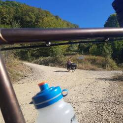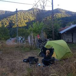Im weiteren Streckenverlauf überqueren wir den Fluss und landen bald darauf an einer Hauptstraße, die wir uns mit deutlich zu vielen Autos und lärmenden LKW teilen. An einer Tankstelle füllen wir unsere Wasservorräte auf und angesichts der fortgeschrittenen Stunde soll dann auch die erste Gelegenheit zum Verlassen der Hauptstraße genutzt werden, um etwas abseits einen Lagerplatz zu finden. Schnell ist ein Abzweig und kurz darauf auch eine geeignete Zeltwiese gefunden. Und wenn man sich die Geräuschkulisse der großen Straße wegdenkt, könnte man fast von einem idyllischen Plätzchen sprechen. Ein leckeres Nudelessen verspeisen wir noch und sitzen anschließend mit Tee und Keksen vor dem Zelt, bis es dunkel ist. Wahnsinnige 30 Kilometer sind wir heute gefahren, überwiegend bergab. Warum so wenig? Tja, frag doch mal die Maus...