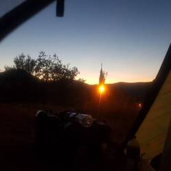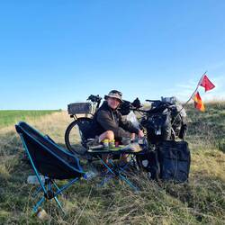 Das heutige Frühstück auf der Hotelterrasse verbringen wir noch entspannt, etwas Anspannung stellt sich allerdings beim Verlassen des Hotels ein. Der freundliche Gastgeber lässt sich nicht davon abbringen, uns helfen zu wollen. Das gemeinsame Heruntertragen der Taschen ist noch unproblematisch, bei den Rädern wird es schwieriger. Leider ist es uns nicht möglich, ihm verständlich zu machen, dass es bedeutend einfacher wäre, diese allein die enge Treppe herunter zu bugsieren. Und so besteht er darauf, irgendwie und irgendwo mit anzufassen und das ganze Unterfangen gibt ein recht abenteuerliches Bild ab. Irgendwie kommen aber am Ende doch Menschen und Räder heil die Treppe hinunter und wir können in eine sonnige Etappe starten. Wenn man sich fragt, was das Gegenteil von Idylle ist..., wir spüren, hören, riechen und sehen es auf den ersten 20 Kilometern des Tages. Auf grobem, ääaäh, nein, natürlich nostalgisch historischem Kopfsteinpflaster rütteln und schütteln wir uns hinauf zum Ortsausgang. Weiter geht es auf einer lauten und sehr verkehrsreichen Straße. Wir durchqueren die Stadt Karabük, wo Lärm und Verkehr noch einmal zunehmen. Nach einem Einkauf lassen wir die Stadt hinter uns und zweigen von der Hauptstraße ab. Die Hoffnung auf mehr Ruhe erfüllt sich jedoch nicht - auch diese Straße ist recht groß und viel befahren. Auch die Umgebung wird nicht gerade hübscher, wir fahren entlang eines riesigen und lauten Stahlwerks mit rauchenden Schornsteinen. Passend zu diesem ganzen Idyll machen wir unsere erste Pause an einer Tankstelle...! Nach etwa 20 Kilometern tritt endlich Besserung ein: Die Straße wird kleiner und der Verkehr weniger, da lässt es sich doch deutlich netter radeln. Mit 30 Grad ist es heute wieder deutlich wärmer als in den letzten Tagen, entsprechend suchen wir uns für die nächste Pause einen ruhigen und vor allem schattigen Platz. Nach Tee, Kaffee, Keksen und Erholung fahren wir auf inzwischen sehr verkehrsarmer Straße weiter, über ungefähr zehn Kilometer geht es leicht, aber stetig bergauf. Es ist 17 Uhr, als wir etwas abseits der Straße einen passenden Platz für die Nacht entdecken. Die kleine, ebene Fläche hinter Büschen am Waldrand könnte möglicherweise mal als Holzlagerplatz gedient haben, nun eignet sie sich perfekt für unser Zelt. Angesichts der frühen Ankunftszeit bleibt uns noch angenehm viel Zeit für Dinge wie Lesen und Drohnenspielerei. Gegen 18 Uhr köchelt das Gemüse, welches wir uns schmecken lassen und dann ist es auch an der Zeit, das Zelt aufzubauen. Als wir nach Fertigstellung des Lagers inklusive der "Inneneinrichtung" mit einem Tee und einer Rolle Nachtischkeksen auf unseren Stühlen vor dem Zelt sitzen, ist es viertel nach sieben und bereits dunkel. Plötzlich hören wir Geräusche aus dem Wald. Das ist natürlich eigentlich nichts Ungewöhnliches, sind doch immer irgendwelche Vögel, Igel oder schlicht der Wind in den Bäumen und Büschen unterwegs. Dieses Geräusch ist aber lauter und lässt ein größeres Tier vermuten. Sehen können wir nichts, aber unser Unbehagen steigert sich doch sehr, als wir ein ziemlich bedrohlich klingendes Knurren hören. Was tun? Claudia will sich instinktiv ins Zelt verziehen, Heiko scannt die Büsche nach einem Fluchtweg in Richtung Straße. Nach kurzem Überlegen machen wir für einen Moment laute Musik auf dem Handy an und tatsächlich - die Geräusche sind anschließend nicht mehr zu hören. So richtig wohl ist uns dennoch nicht zumute. Sollen wir bleiben? Oder abbauen und weiterfahren? Aber wohin in der Dunkelheit? Sollen wir nachts abwechselnd wach bleiben und Wache halten? Diese Fragen stellen wir uns noch, als erneut Geräusche zu vernehmen sind. Okay, genug ist genug, das gefällt uns nicht! Wir räumen unser Zelt wieder leer und ab, schnell sind die Räder wieder bepackt. Laut Google Maps stehen in 1,3km Entfernung einige Häuser, diese wollen wir ansteuern. Da es noch nicht allzu spät ist, hoffen wir darauf, Menschen anzutreffen, die wir um die Möglichkeit einer Übernachtung auf sicherem Terrain fragen können. Unterwegs fällt Heiko plötzlich eine eigenartige Lichterkette am Himmel auf, was erst einmal ziemlich spooky auf uns wirkt. Tatsächlich sehen wir die Star Link Satelliten von Elon Musk, über die wir später lesen: "Nach jedem neuen Start fliegen die Satelliten erstmal in einer Kette beieinander, bevor sie sich auf die für sie vorgesehenen Umlaufbahnen verteilen. Es ist ein Spektakel, die Satelliten in dieser Formation als Perlenkette am Himmel zu sehen."