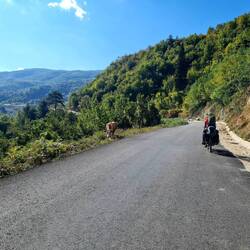 Wir stehen um acht Uhr auf, bauen das Zelt ab und beladen unsere Räder. Aus dem Haus unserer "Gastfamilie" tönt bereits reges Stimmengewirr, vom Balkon des Nachbarhauses ruft man uns ein herzliches "Günaydın" zu. Um neun Uhr werden wir zum gemeinsamen Frühstück erwartet. Unsere Räder parken wir vor dem Haus, damit wir im Anschluss direkt startklar sind. Der Frühstückstisch ist nicht minder reich gedeckt als am gestrigen Abend. Brot, grüne und schwarze Oliven, Gurken und Tomaten, gekochte Eier, Käse, Marmelade, fluffig-knusprige Pancake(-artige) mit Pinienmelasse..., sehr, sehr lecker! Wie bei fast jeder neuen Bekanntschaft wird noch ein Abschiedsfoto gemacht, dann machen wir uns angesichts der vollen Bäuche recht schwerfällig auf den Weg. Dieser führt uns weiter an der traumhaften Küste entlang und hat in sehr regelmäßigen Abständen ganz ordentliche "Bodenwellen" im Angebot. An einem Luxus-Pausenplatz mit Bank, Tisch und sensationellem Ausblick steht ein weiteres Mal unsere weitere Route auf dem Prüfstand. Die vor zwei Tagen getroffene Entscheidung, entgegen einer vorherigen Entscheidung zum Abweichen von der ursprünglichen Planung, in Kürze doch entsprechend des Primärplans das Meer zugunsten der Berge zu verlassen, wackelt erneut. Es ist einfach sooo schön an der Küste! Also studieren wir Karte und Höhenprofile und wägen ein weiteres Mal ab: sichere Asphaltstraßen vs. teilweise unbefestigte Wege unbekannten Zustandes, viele Höhenmeter vs. sehr viele Höhenmeter, 218 vs. 146 Restkilometer bis zum nächsten Zwischenziel Safranbolu, Küste vs. Berge, gute Versorgungsinfrastruktur vs. einsame Gegenden...! Während wir noch über den Zahlen brüten, kommt ein türkischer Radreisender mit leuchtend gelben Ortlieb-Taschen den Berg hinaufgekeucht, den wir gleich hinunterrollen dürfen. Er heißt Mehmet und kommt aus İstanbul. Da er recht gut englisch spricht, tauschen wir uns eine Weile über unsere Reisen und über unterwegs getroffene Reisende aus. So können wir Mehmet z.B. berichten, dass er möglicherweise das türkische Radlerpaar, welches uns in der Nähe von İnceburun begegnet ist, treffen wird. Laut Instagram sind die beiden uns seit Tagen dicht auf den Fersen. Mehmet radelt irgendwann weiter und wir verschieben die finale Routen-Entscheidung auf den Moment, in welchem wir abzweigen müssten oder eben auch nicht. An der Weggabelung angekommen fällt die Wahl auf die Berge und damit auf weniger Kilometer, viele statt sehr viele Höhenmeter, Einsamkeit und Schotterpisten. Der tolle Ausblick während der letzten Pause war also der letzte auf das Schwarze Meer, auf einer kleinen, verkehrsarmen Straße entfernen wir uns von der Küste. In einem Dorf decken wir uns mit reichlich Proviant ein, bevor wir uns durch leicht welliges Terrain sanft bergauf in Richtung Bergwelt bewegen. Zwischendurch gibt's ein kleines Päuschen mit Obst und Joghurt. Außerdem erreicht uns die Information, dass Mehmet tatsächlich das türkische Radlerpaar getroffen hat und auch die beiden schicken uns eine entsprechende Nachricht. Dem mitgeschickten Foto entnehmen wir, dass sie gemeinsam zelten. Wir hingegen zelten allein, einen Platz dafür finden wir heute etwas unterhalb der Straße an einem trockenen Flussbett zwischen Haselnussplantagen. Ein Esel nimmt Notiz von uns, eine Bäuerin begrüßt uns, zwei Kinder kommen vorbei, ein Hund mit Glocke um den Hals besucht uns, eine Kuh wird die Straße entlanggetrieben und von einigen vorbeiknatternden Fahrzeugen wird uns zugewunken. Niemand von ihnen scheint etwas gegen unsere Anwesenheit zu haben, ganz im Gegenteil. Na dann: İyi geceler! Czytaj więcej