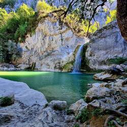 Im Verlauf erreicht der Holzweg stellenweise eine Höhe von 100 – 150 Metern, aus spektakulärer Perspektive können wir die ganze Schönheit des Canyons genießen. Die Szenerie erinnert an die Kulisse von Fantasy-Filmen. Heiko hat das Gefühl, dass hier auch aus dem Nichts Flugsaurier vorbeischweben könnten und man würde sich nicht einmal wundern. Wir lassen uns extrem viel Zeit beim Durchwandern dieser wundervollen Schlucht und freuen uns darüber, dass der Holzweg sogar für uns Fischköppe problemlos zu bewältigen ist. Fasziniert und begeistert marschieren wir im kühlen Schatten der imposanten Felswände, viele Bäume haben passend zur Temperatur ein Moosmäntelchen übergeworfen. Tief unter uns bahnt das Wasser sich seinen Weg durch den Canyon. Am Ende des Wanderwegs erreichen wir schließlich den Ilıca-Şelalesi (Wasserfall), der sich aus 15m Höhe in einen natürlichen Pool ergießt. Auch hier verbringen wir eine ganze Weile und genießen/ fotografieren/ filmen den Anblick des Wasserfalls in seiner fast exotisch aussehenden Kulisse von allen Seiten.