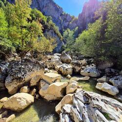 Wir beginnen dem Tag mit einem leckeren Frühstück im Restaurant des Hotels. Unseren Plan, danach auszuchecken, eine Schlucht-Sanderung zu machen und am Nachmittag entweder in die nächste Radel-Etappe zu starten oder aber ggf. neu einzuchecken, verwerfen wir. Wir bleiben einfach bis morgen hier, schließlich haben wir Urlaub und da sollte Stress unbedingt vermieden werden. Nach Bekanntgabe unserer Verlängerung an der Rezeption rüsten wir uns für den Wandertag. Knapp vier Kilometer spazieren wir bis zum Eingang der Horma-Schlucht. Diese liegt in einem Nationalpark, dem Karstplateau "Küre Dağlar Milli Parkı", der sich im namensgebenden Gebirgszug Küre Dağları des Westpontischen Gebirges in der nordtürkischen Schwarzmeerprovinz Kastamonu befindet. Die vor Jahrhunderten durch den Zarı-Strom entstandene Horma-Schlucht wurde mittels eines