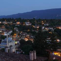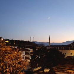 Eine weitere Delikatesse Safranbolus ist „Lokum“, eine auf Sirup beruhende Süßigkeit. So überrascht es nicht, dass man in den Altstadtgassen neben kleinen Fachwerkhäusern aus verschiedenen Materialien, die als Deko-Elemente, Zuckerdosen, Kühlschrankmagnete etc. zum Verkauf angeboten werden, in fast jedem zweiten Laden qietschbuntes, süß-klebriges Lokum erwerben kann. Unser Spaziergang führt uns auf einen Hügel hinauf zum alten gelben Regierungsgebäude, das in ein Stadtmuseum umgewandelt wurde. Neben dem eindrucksvollen Gebäude, welches wir nur von außen besichtigen, genießen wir hier vor allem den fantastischen Blick über die Altstadt. In selbige schlendern wir nach einer Weile zurück und lassen uns im Außenbereich eines sehr netten Restaurants zum Mittagessen nieder. Als Nachspeise gibt es standesgemäß Safran-Reispudding, zumindest für Claudia, Heiko bleibt dem geliebten Baklava treu. Und weil wir so gerne Städte von oben betrachten, marschieren wir als nächstes auf der anderen Seite des Ortes einen Hügel hinauf. Eine Parkanlage mit Café und einer Aussichtsplattform ist unser Ziel. Eine ganze Weile verbringen wir hier und erfreuen uns an der neuen Perspektive auf die Stadt. Hin und wieder spuckt ein Bus eine Ladung Menschen aus, saugt sie aber auch nach einigen Minuten für Fotos wieder ein und braust davon. Nach ausgiebiger Film- und Fotorunde von Heiko und drei gelesenen Romankapiteln von Claudia machen wir uns auf den Rückweg. Nach einem kurzen Zwischenstopp im Hotel steuern wir rechtzeitig zum Sonnenuntergang erneut das Stadtmuseum an, wo uns die Aussicht auf die Altstadt so gut gefallen hat. Es ist bereits dunkel, als wir uns anschließend durch die Altstadtgassen schlängeln und nach einem netten Lokal Ausschau halten. Wir werden schnell fündig, erfreuen uns an Döner und Mantı und schlendern schließlich satt und zufrieden zum Hotel. Hier lädt der Hotelbetreiber uns noch auf einen Tee ein, den wir uns auf der nicht nur bunt dekorierten, sondern jetzt auch bunt beleuchteten Terrasse schmecken lassen. So geht der Touri-Tag zu Ende, morgen wird wieder geradelt!