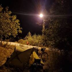 Eigentlich haben wir ohnehin gerade Spektakel genug, aber dieses Schauspiel fasziniert uns doch. Die angepeilten Häuser sind schließlich schnell erreicht, Menschen suchen wir jedoch vergeblich. Wir beschließen dennoch, auch ohne eine offizielle Erlaubnis hier zu bleiben. Neben der Straße bietet sich eine kleine, wilde Wiese an, auf welcher wir im Schein einer Straßenlaterne unser Zelt aufbauen. Hier fühlen wir uns deutlich sicherer als am Waldrand und unsere Erfahrung war bislang stets so, dass die Menschen uns freundlich begegnen und offensichtlich kein Problem mit wild zeltenden Touristen haben. Wir hoffen, das ist auch heute der Fall (falls überhaupt noch jemand vorbeikommt...), ein erneuter Abbau wäre ziemlich ärgerlich. In unseren Schlafsäcken liegend waren wir noch nie so froh, vom Licht einer Laterne beschienen zu werden. Was war das bloß für ein Tier? Oder Tiere? Das würde uns so sehr interessieren..., wir werden es wohl nie erfahren!