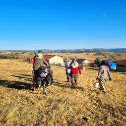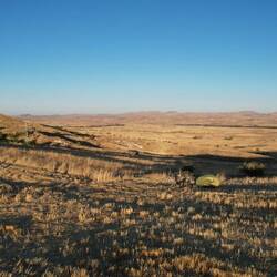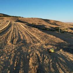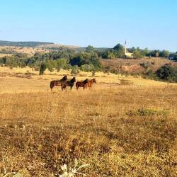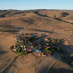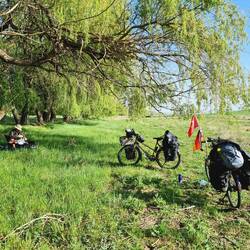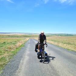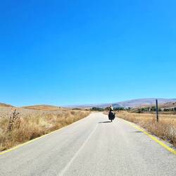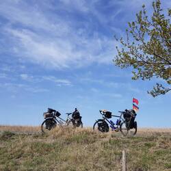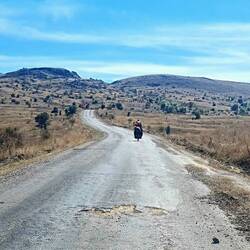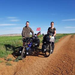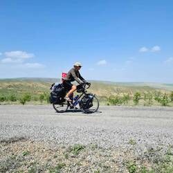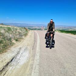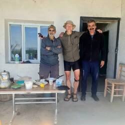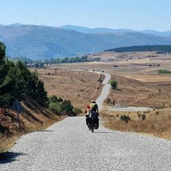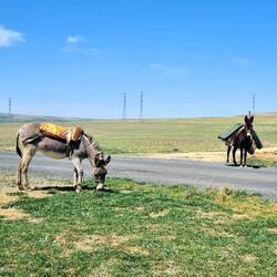 Nach der üblichen Morgenroutine verlassen wir gegen halb zehn "unser" Stoppelfeld. Nur wenige Bergabkilometer sind es bis in den Ort Orta (er heißt wirklich so...), wo wir an einer Tankstelle für ausreichend Wasser und Kekse an Bord sorgen. Nebenbei werden wir noch zu einem Tee eingeladen. Durch eine steppenartige Landschaft führt unser Weg nach Verlassen des Dorfes, in dieser Kulisse könnte auch ein Western gedreht werden. Dank des recht ruppigen Streckenzustandes fühlt es sogar sich fast so an, als würden wir mit unseren Drahteseln durch die Prärie reiten. Ein Auto, das neben uns anhält, holt uns in die Realität zurück. Der Fahrer wohnt drei Dörfer weiter und möchte uns gerne einladen. Heiko vermittelt ihm ein dankendes "vielleicht" und nach Austausch unserer Telefonnummern "reiten" wir zunächst weiter unseres Weges. Tatsächlich sollen wir dann bereits im ersten Dorf hängen bleiben. Eine Frau auf einem Traktor überholt uns und winkt freundlich. Einige Augenblicke später legt sie den Rückwärtsgang ein