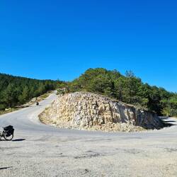 Schon früh kreist die Drohne über Menteşe Köyü, nachdem uns der Wecker um halb sieben aus dem Schlaf geklingelt hat. Ab viertel vor neun geht es weiter, wie es endete: Wir pflügen uns durch den Schotter nach oben. Auf einer Höhe von 1240m haben wir den Gipfel erreicht, was jedoch nicht heißt, dass es nun entspannter wird. Der Untergrund hält weiterhin herausfordernde Abschnitte bereit, die sich mit etwas besser fahr- bzw. schiebbaren Teilstrecken abwechseln. So geht es eine Weile auf und ab, während sich vermehrt mächtige Felsen in unser Blickfeld schieben. Wir sind von einer angenehmen Stille umgeben. Neben der einen oder anderen Tierstimme besteht die Geräuschkulisse hauptsächlich aus unserem selbst produzierten Schottergerumpel und angestrengtem Gekeuche (ganz eventuell kommt uns auch der eine oder andere leise Fluch über die Lippen...). Eine eindrucksvolle Schlucht lässt sich erahnen, als wir uns bei mal wieder starkem Gefälle mehrere hundert Höhenmeter abwärts arbeiten. Auf einer Höhe von 400m angekommen überqueren wir eine Brücke, die bei Gültepe über den Devrekanı Stream führt. Hier treffen wir einen jungen Mann, der das Heimatdorf seiner Mutter in Bergen besucht hat, wo wir gerade herkommen. Er berichtet von Bären in der Gegend und dass er entsprechende Spuren gesehen hat. Wir fühlen uns bestätigt, dass es eine gute Idee war, gestern nicht mitten im Wald gezeltet zu haben. Kurz hinter dem Ort Gültepe werden wir sofort wieder gefordert, auf 830m liegt der nächste zu erklimmende "Gipfel". Laut Recherche sollen wir dort ein Dorf oder zumindest eine Häuseransiedlung erreichen. Unser Plan sieht vor, dort nach einem Platz für die Nacht Ausschau zu halten. Am Ziel angekommen stellen wir aber fest, dass das "Dorf" etwas abseits unserer Route liegt und somit einen kleinen Umweg bedeuten würde. Also nehmen wir noch die folgende Abfahrt mit und erreichen kurz darauf den Ort Pınarbaşı, der laut Google über mindestens zwei Hotels verfügt. Wir steuern eines der Hotels an, sind aber schneller wieder draußen, als wir reingekommen sind. Von der Straße sah das Haus noch recht ansehnlich aus, beim Anblick des Eingangs auf der Rückseite fühlte Claudia sich allerdings bereits das erste Mal an ihre aktuellen Lektüre erinnert: Der Krimi handelt von seeehr seltsamen und brutalen Vorgängen in einem renovierungsbedürftigen Hotel...! Dabei wollten wir uns eigentlich nicht von der schlechten Google-Rezension beeinflussen lassen, in welcher davon die Rede ist, dass der vorbestrafte und psychisch auffällige Sohn des Hotelbetreibers einen Gast angegriffen haben soll. Nun steht er vor uns, der Hotelbetreiber, und macht einen ziemlich schrägen Eindruck auf uns. Wir schleppen dennoch unsere Taschen in das uns zugewiesene winzige "Zimmer", das nach Rauch riecht und in dem man sich kaum um die eigene Achse drehen kann. Als er dann aber ausschließlich "Cash" von uns möchte und keine Kartenzahlung akzeptiert, entscheiden wir uns zum geordneten Rückzug. Wir ändern unsere Meinung auch nicht mehr, als er dann plötzlich doch noch ein Kartenlesegerät hervorkramt. Es ist nicht weit bis zum nächsten Hotel und hier haben wir deutlich mehr Glück. Im