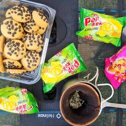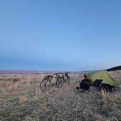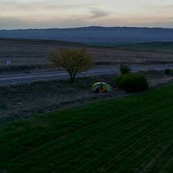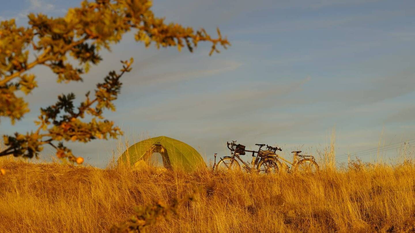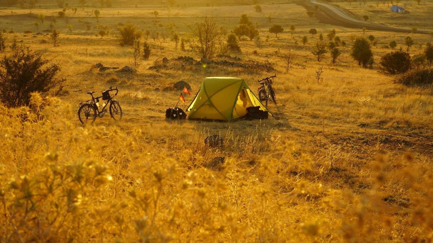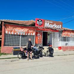 Bei Erreichen einer großen Hauptstraße bietet sich ein kleiner "Market" zum Einkaufen an. Die Taschen werden mit Proviant gefüllt, ein Kaltgetränk rinnt unsere Kehlen hinunter, dann geht's weiter. Wir überqueren die Hauptstraße und folgen dem Weg, der hinauf führt. Es wollen noch einige Höhenmeter bewältigt werden, bevor wir den Radel-Feierabend einläuten. Gleichzeitig geben wir aber auch das Ziel aus, im besten Fall noch vor Erreichen des Gipfels einen Schlafplatz zu finden. Anderenfalls würden wir die kleine Stadt Balâ erreichen, wo angesichts der in den nächsten Tagen eher sehr dürftigen Infrastruktur und entsprechend auch Versorgungslage eine größere Verproviantierung geplant ist. Einen Zeltplatz erst nach Einkauf und Verlassen der Stadt suchen zu müssen, möchten wir angesichts der fortgeschrittenen Zeit vermeiden. Mal wieder ist es nicht ganz einfach, in dieser offenen, weit einsehbaren Gegend ein geeignetes Plätzchen zu finden, aber am Ende ist auf Heikos Campingplatz-Adlerauge Verlass. Etwas abseits der kaum bis gar nicht befahrenen Straße lassen wir uns nieder, im unmittelbaren Nachbarschaftsbusch trällert ein Vogelchor ein lautes Konzert in Dauerschleife. Auf dem Gaskocher köcheln Nudeln mit frischer Aubergine in Tomatensauce. Ehrlicherweise muss man sagen, dass das mutmaßlich als Tomatensauce gekaufte Glas nicht Sauce, sondern Tomatenmark enthält, dass tut dem Geschmack aber nach Wasserstreckung und Kräuterwürzung keinen Abbruch. Zum Ausklang des Tages gibt es natürlich Tee und Kekse, Heiko betreibt etwas Drohnenspielerei und Claudia liest, bevor am Himmel das Licht ausgeknipst wird und wir uns auf die Isomatten begeben.