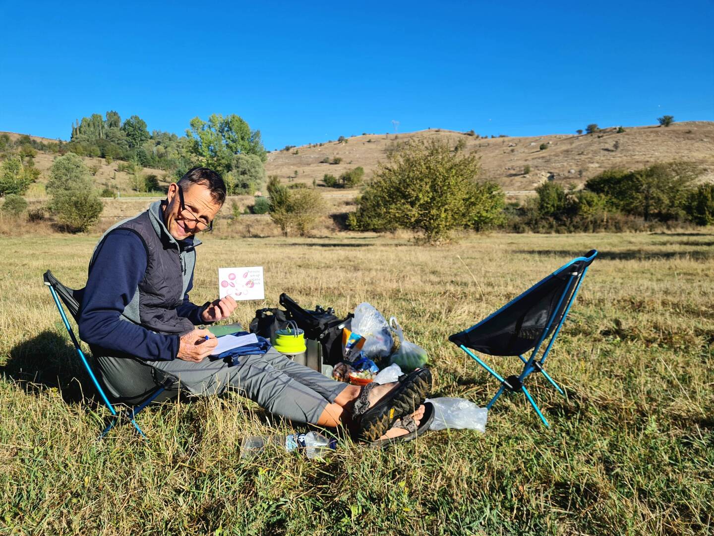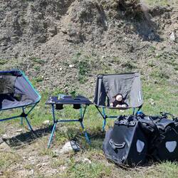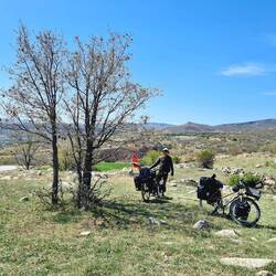 Um sieben Uhr sind wir wach und fangen direkt an, unser Lager zu räumen, so dass bereits gegen acht Uhr die Räder bepackt sind. Kurz verabschieden wir uns noch von dem älteren Herrn, auf dessen Wiese wir gezeltet haben, dann rollen wir vom Hof. Nur ungefähr einen Kilometer weiter bietet sich ein schöner Platz für unser Frühstück an. Unter großen Weiden an einem kleinen Bach mit lauten quakenden Kröten bauen wir Campingküche sowie -esszimmer auf uns stärken uns für den Tag. Wie so oft wird unsere Rast auch heute wieder von einer vorbeiziehenden Schafherde begleitet. Erst um elf Uhr machen wir uns auf den Weg, zum Start ist direkt der erste Berg zu erklimmen. Oben in etwa 1300m Höhe angekommen rufen uns zwei Männer heran, die gerade an einem Haus werkeln oder eher vor selbigem von der Arbeit pausieren. Die beiden bieten uns zwei Stühle an und laden uns zum Tee ein und so verweilen wir hier für eine sehr nette halbe Stunde.