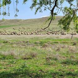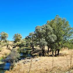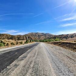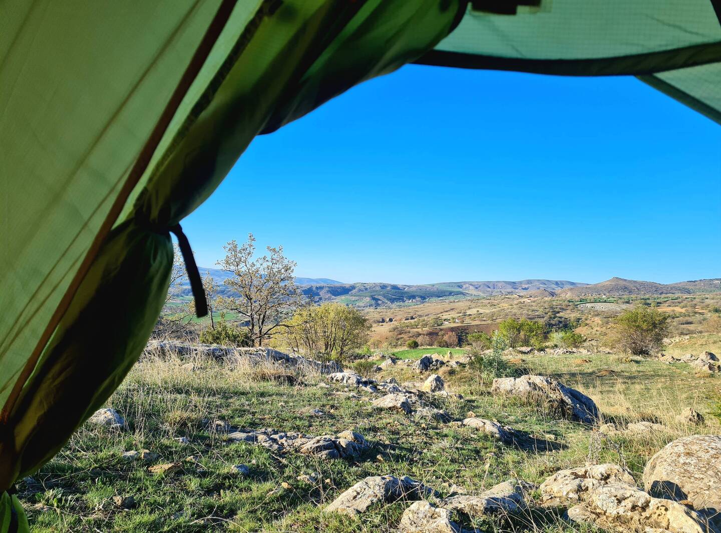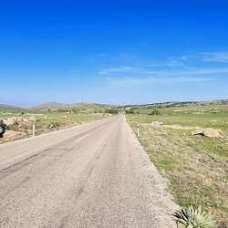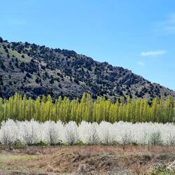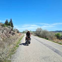 Früh am Morgen sind wir wach, lassen den Tag aber seeehr gemütlich angehen. Nach Frühstück und dem einen oder anderen Heißgetränk, lesen, schreiben usw. sitzen wir erst um elf Uhr auf den Fahrrädern. Die heutige Etappe beginnt mit einigen Kilometern Abfahrt, die uns im Verlauf durch ein felsiges, mit prachtvoll in weißer Blüte stehenden Bäumen geschmücktes Tal führt. Als wir dieses hinter uns lassen, radeln wir durch eine Gegend, die sich als landwirtschaftliche Einöde mit dem einen oder anderen Hügelchen beschreiben lässt. Gegen Mittag legen wir wie üblich eine ausgedehnte Pause ein, danach geht es einigermaßen unspektakulär weiter.
