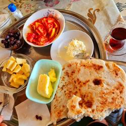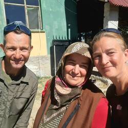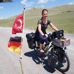 Wir sind bereits vor dem Wecker und vor der Sonne wach, was Heiko zum Aufstehen motiviert. Claudia ist zunächst mäßig begeistert, lässt sich dann aber doch von einem Sonnenaufgangsfrühstück vor dem Haus überzeugen. In der folgenden Zeit bekommen wir nach und nach Besuch von einzelnen, uns bereits bekannten Dorfbewohnern. Eine Frau wünscht und einen guten Morgen und überreicht uns gekochte Kartoffeln und selbst gebackenes Brot. Der deutsch sprechende Herr erkundigt sich, wie wir die Nacht verbracht haben und fragt nach unserer weiteren Route. Der junge Hirte bietet uns Kaffee bzw. Frühstück an, was wir aber angesichts unserer just verspeisten Morgenmahlzeit dankend ablehnen. Irgendwann spricht die nächste Frau eine Einladung zum Kaffee aus und nun können wir nicht mehr nein sagen. Also spazieren wir mit ihr zum Haus der Familie. Uns wird gezeigt, wo und wie das Brot und die Nudeln hergestellt werden und auch die Inneneinrichtung des Hauses (z.B. ein liebevoll gestaltetes Hängeschränkchen) wird stolz präsentiert. Und währenddessen erfolgt immer wieder die Aufforderung: "Fotoğraf çek, fotoğraf çek!" Nachdem wir alles interessiert angesehen und wunschgemäß fotografiert haben, sitzen wir alle unter einer großen Überdachung zusammen und trinken türkischen Kaffee. Während wir gestern von dem deutsch sprechenden Herrn erfahren haben, dass er nur die Sommermonate in diesem Dorf verbringt und ansonsten in der Stadt Karabük wohnt, leben unsere heutigen Gastgeber ganzjährig mit ihren Tieren hier. Vier Monate Schnee, von denen sie uns erzählen, lassen harte Winter vermuten. Dem jungen Hirten gehören auch die schönen Pferde, die wir gestern bewundert haben, als sie im Abendlicht über den Hügel galoppiert sind. Bevor wir uns verabschieden, sollen wir einer Frau noch in den Garten folgen. Aus einem kleinen Gewächshaus pflückt sie uns Gurken, Tomaten und Pepperoni, die wir mitnehmen sollen. Diese Idee hatte auch einer der Herren, der uns mit einer Tüte voll frisch geerntetem Gemüse entgegenkommt. Das Abendessen ist gesichert! Froh und dankbar, diese sehr herzlichen und besonderen Familien kennengelernt zu haben, verlassen wir um elf Uhr das kleine Dorf Çömlekçiler. Begeistert radeln wir durch die offene, inzwischen fast wieder steppenartige Landschaft. Es dominieren wieder sandige Erdtöne, vereinzelte winzige Dörfer wirken wie grüne Oasen in der ansonsten trocken anmutenden Weite. Knapp zehn Kilometer sind wir gefahren, da legen wir bereits die erste Pause ein. Am Rande eines Feldes sitzend lassen wir uns die Geschenke unserer Gastgeberfamilien der letzten Nacht schmecken: Es gibt das selbstgebackene Brot, das wir mit gesalzenen Pellkartoffeln und dem Gemüse, welches vor zwei Stunden noch im Gewächshaus hing, füllen. Köstlich! Und während wir da so sitzen, hören wir immer mal wieder ein Rascheln hinter und neben uns. Nicht lange dauert es, da bekommen wir die Ursache für das Rascheln zu Gesicht: Eine kleine Maus guckt uns zwischen den trockenen Grashalmen mit ihren Knopfaugen an. Sie wird mit der Zeit immer mutiger und zeigt sich interessiert an unseren Resten von Gurke, Tomate und Apfel. Es ist herrlich, dieses niedliche Tier zu beobachten. Und was sollen wir sagen, plötzlich sind mehr als zwei Stunden vergangen und wir sitzen immer noch hier. Das angedachte heutige Pensum werden wir voraussichtlich nicht mehr schaffen, aber für ein paar Kilometer schwingen wir uns nochmal in den Radsattel. Abwärts dürfen wir durch ein sehr schönes Tal rollen, parallel zu unserem Weg plätschert ein Fluss. Irgendwann überholt uns ein Auto, wendet wenig später und hält kurz vor uns an. Der Fahrer springt aus dem Auto, öffnet den Kofferraum und erwartet uns mit einer Tüte Äpfel und Birnen. Zusätzlich öffnet er zwei kalte Flaschen Selters und überreicht sie uns. Mit einem freundlichen "Hoş geldiniz" heißt er uns zudem in seiner Heimat willkommen, dann steigt er wieder ins Auto und fährt weiter. Mal wieder, wie schon so oft, fasziniert von der Freundlichkeit der Menschen, verstauen wir das Obst in den Packtaschen und stoßen mit den kleinen Wasserflaschen an. Prost!