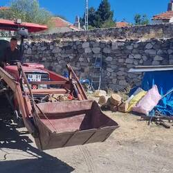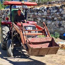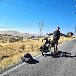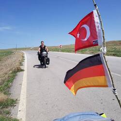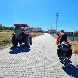 und kommt neben uns zum Stehen. Sie möchte uns zum Tee zu sich nach Hause einladen. Und so folgen wir ihrem kleinen Traktor bis auf den Hof. Mal wieder bleibt es nicht bei Tee, sondern die Bäuerin tischt eine ganze Mahlzeit auf. Warmes Brot serviert sie uns, dazu gibt es Oliven, frisch geerntete Tomaten sowie Butter und Käse aus eigener Herstellung. Die Frau berichtet uns, dass sie Witwe ist und ihre Kinder in verschiedenen Städten wohnen. Sie selbst sei nie bis über das wenige Kilometer entferne Orta hinausgekommen. Haus und Hof bewirtschaftet sie allein, was nicht immer einfach sei. Wir haben den Eindruck, dass sie sich über etwas Gesellschaft und Menschen zum Reden (auch wenn diese längst nicht alles verstehen...) freut. Und wir freuen und unsererseits über die Gastfreundschaft und die Köstlichkeiten auf dem Tisch. Nach dem Essen werden wir noch in den kleinen Stall am Haus geführt. Die neun Kühe der Bäuerin sind mit einem Hirten unterwegs, aber sie zeigt uns stolz ihre fünf Kälber, die aktuell etwa vier bis fünf Monate alt sind. Als wir wieder auf dem Hof stehen und uns eigentlich verabschieden wollen, hat unsere Gastgeberin noch eine spezielle Aufgabe für Heiko. Nicht sein Fahrrad soll er besteigen, sondern ihren Traktor. Nach kurzer Einweisung in alle Hebel und Knöpfe knattert Heiko über den Hof, auch das von der Bäuerin geforderte Einparkmanöver (rückwärts) meistert er bravourös. Sie wartet bereits mit ihrer Schaufel an einem Haufen von Irgendwas, um das Gefährt zu beladen. Die Kooperation klappt, Heiko hat sichtlich Spaß, genug Arbeit ist da..., alle Voraussetzungen für einen Jobwechsel mit Verbleib in der Türkei scheinen erfüllt. Aber bleiben wir in der harten Realität..., wir sollen wohl weiterfahren. Aber gerade, als wir genau das in die Tat umsetzen wollen, erscheint auf einem höher gelegenen Grundstück die Nachbarin unserer Gastgeberin. Lauthals wird ihr zugerufen, dass wir deutsche Radreisende sind. Nun möchte die Nachbarin uns auch einladen und winkt bereits mit dem Teeglas. Was bleibt uns also anderes übrig, als uns von der ersten Gastgeberin zu verabschieden und einige Meter weiter bei der nächsten einzukehren...! Uns werden Plätze auf der Terrasse zugewiesen, von wo aus wir der Bäuerin zuwinken können, die kurz darauf wieder mit ihrem Traktor vom Hof tuckert. Wir genießen indes das fünfte und sechste Glas "Einladungs-Tee" des heutigen Tages und auch "Yemek, yemek" (essen, essen) heißt es erneut. Ein weiteres warmes Brot mit Butter (die selbstgemachte von der Nachbarin...) wartet darauf, von uns verzehrt zu werden, dazu gibt es Käse und Pepperoni aus dem Garten. Mit reichlich vollen Bäuchen gelingt uns irgendwann der Abschied und wir radeln wieder gen Süden. Als wir den dritten Ort erreichen, sind wir fast ein bisschen froh, dass wir den zweifelsohne netten Herrn, der uns hier einladen wollte, nicht antreffen. Auf eine aktive Kontaktaufnahme verzichten wir, das Fassungsvermögen unserer Mägen hat schlicht und einfach Grenzen. Im weiteren Streckenverlauf erklimmen wir unseren letzten Gipfel in 1700m Höhe. Unsere Idealvorstellung sah so aus, dass wir hier oben einen schönen Platz zum Zelten mit Fernsicht und Sonnenuntergang finden. Leider erfüllt sich dieser Wunsch nicht und so bleibt es bei einer Gipfel-Pause. Rasch verlieren wir auf der Weiterfahrt wieder an Höhe, stets rechts und links nach einem guten Lagerplatz Ausschau haltend. Ganz einfach ist es aber heute nicht. Entweder sind die passenden Wiesen eingezäunt oder der Untergrund ist zu "pieksig" für das Zelt oder uns ist die Gegend nicht ganz geheuer oder, oder, oder...! Wir sind bereits ein beträchtliches Stück abwärts gerollt, als wir einen Platz entdecken, der mit Abstrichen einigermaßen okay ist. Während wir noch an der Straße stehen und überlegen, hält ein Auto neben uns. Der Fahrer spricht deutsch, da er in Bielefeld gearbeitet hat, und wohnt im nächsten größeren Ort namens Çubuk. Er gibt uns seine Kontaktdaten und würde sich freuen, wenn wir uns morgen auf unserer Durchreise bei ihm melden würden, um gemeinsam Tee zu trinken. Auf Nachfrage erklärt er uns noch, dass das Zelten an der von uns ausgesuchten Stelle kein Problem sei, dann fährt er weiter. Wir bugsieren unsere Fahrräder von der Straße hinunter auf die "wilde Wiese" und machen es uns auf unseren Campingstühlen bequem. Heiko kocht Kartoffeln zum Abendessen, bei Einbruch der Dämmerung stellen wir das Zelt auf. Etwas verunsichert werden wir, als später ein Auto auf unserer Höhe hält, der Fahrer aussteigt und telefoniert. Er hält ein zweites Auto an, die Fahrer unterhalten sich und wir fragen uns, ob das Ganze möglicherweise uns und unserer "Wildzelterei" gilt. Tatsächlich stellt sich aber heraus, dass der Grund für das Anhalten genau an dieser Stelle eine Autopanne ist. Die Fahrer haben folglich ganz andere Sorgen als zeltende Touristen. Ganz im Gegenteil: Als sie uns wahrnehmen, winken sie uns freundlich zu und stellen ein paar interessierte Fragen, das war's auch schon. Das defekte Fahrzeug, welches noch eine ganze Weile mit eingeschaltetem Warnblinker am Straßenrand steht, wird irgendwann abgeschleppt und wir treten ein letztes Mal die Nachtruhe in unserem kleinen Zelt an. İyi geceler!