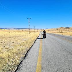 Kühl ist es noch am Morgen, wenngleich die Nacht gefühlt wärmer war als die letzte. Eingemummelt in unseren Schlafsäcken frühstücken wir in aller Ruhe und als die ersten Sonnenstrahlen uns erreichen, wird es dann auch sofort merklich wärmer. Um viertel vor zehn verlassen wir unseren Platz am fröhlich zwitschernden Vogelbusch und strampeln zum Einstieg der heutigen Etappe bergauf. Am höchsten Punkt erreichen wir die Stadt Balâ, wo wir wie geplant einkaufen und unsere Taschen mit Proviant für drei Tage füllen. Deutlich schwerer als zuvor rollen wir schließlich stadtauswärts, zu unserer Freude erwartet uns eine längere Abfahrt. Balâ liegt hinter uns, vor uns eröffnet sich uns der Blick in eine schier endlos wirkende Weite. Unabhängig voneinander haben wir beide das Gefühl, den Großraum Ankara nun endgültig zu verlassen.
